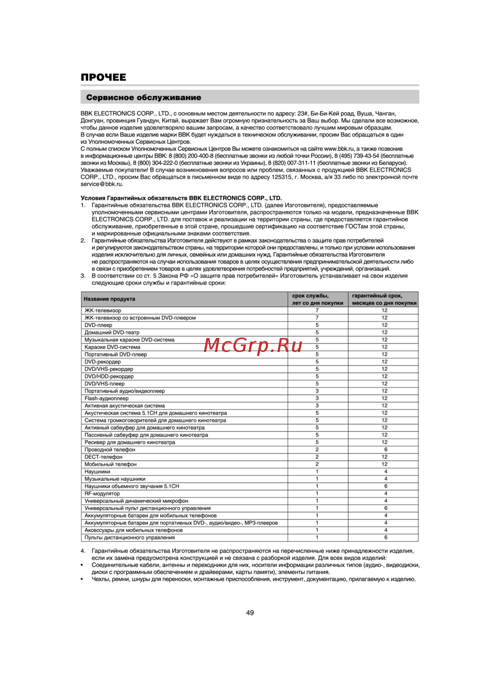 ПРОЧЕЕ Сервисное обслуживание ВВК ELECTRONICS CORR LTD с основным местом деятельности по адресу 23 Би Би Кей роад Буша Чанган Донгуан провинция Гуандун Китай выражает Вам огромную признательность за Ваш выбор Мы сделали все возможное чтобы данное изделие удовлетворяло вашим запросам а качество соответствовало лучшим мировым образцам В случае если Ваше изделие марки ВВК будет нуждаться в техническом обслуживании просим Вас обращаться в один из Уполномоченных Сервисных Центров С полным списком Уполномоченных Сервисных Центров Вы можете ознакомиться на сайте www bbk ru а также позвонив в информационные центры ВВК 8 800 200 400 8 бесплатные звонки из любой точки России 8 495 739 43 54 бесплатные звонки из Москвы 8 800 304 222 0 бесплатные звонки из Украины 8 820 007 311 11 бесплатные звонки из Беларуси Уважаемые покупатели В случае возникновения вопросов или проблем связанных с продукцией ВВК ELECTRONICS CORP LTD просим Вас обращаться в письменном виде по адресу 125315 г Москва а я 33 либо по электронной почте service bbk ru Условия Гарантийных обязательств ВВК ELECTRONICS CORP LTD 1 Гарантийные обязательства ВВК ELECTRONICS CORP LTD далее Изготовителя предоставляемые уполномоченными сервисными центрами Изготовителя распространяются только на модели предназначенные ВВК ELECTRONICS CORP LTD для поставок и реализации на территории страны где предоставляется гарантийное обслуживание приобретенные в этой стране прошедшие сертификацию на соответствие ГОСТам этой страны и маркированные официальными знаками соответствия 2 Гарантийные обязательства Изготовителя действуют в рамках законодательства о защите прав потребителей и регулируются законодательством страны на территории которой они предоставлены и только при условии использования изделия исключительно для личных семейных или домашних нужд Гарантийные обязательства Изготовителя не распространяются на случаи использования товаров в целях осуществления предпринимательской деятельности либо в связи с приобретением товаров в целях удовлетворения потребностей предприятий учреждений организаций 3 В соответствии со ст 5 Закона РФ О защите прав потребителей Изготовитель устанавливает на свои изделия следующие сроки службы и гарантийные сроки Название продукта ЖК телевизор ЖК телевизор со встроенным DVD плеером DVD плеер Домашний DVD театр Музыкальная караоке DVD система Караоке DVD система Портативный DVD плеер срок службы лет со дня покупки гарантийный срок месяцев со дня покупки 7 7 5 5 12 12 12 12 12 12 5 5 5 5 5 5 DVD рекордер DVD VHS рекордер DVD HDD рекордер DVD VHS плеер 5 3 3 3 5 5 Портативный аудио видеоплеер Flash аудиоплеер Активная акустическая система Акустическая система 5 1 СИ для домашнего кинотеатра Система громкоговорителей для домашнего кинотеатра Активный сабвуфер для домашнего кинотеатра Пассивный сабвуфер для домашнего кинотеатра Ресивер для домашнего кинотеатра Проводной телефон DECT телефон 5 5 5 2 2 2 1 1 1 Мобильный телефон Наушники Музыкальные наушники Наушники объемного звучания 5 1СН RF модулятор Универсальный динамический микрофон Универсальный пульт дистанционного управления Аккумуляторные батареи для мобильных телефонов Аккумуляторные батареи для портативных DVD аудио видео МРЗ плееров Аксессуары для мобильных телефонов Пульты дистанционного управления 1 1 1 1 1 1 1 12 12 12 12 12 12 12 12 12 12 12 12 12 6 12 12 4 4 6 4 4 6 4 4 4 6 4 Гарантийные обязательства Изготовителя не ра