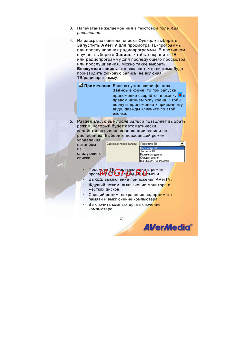 ![Aver Media TV Hybrid+FM Vola [73/77] Раздел действие после записи позволяет выбрать режим который будет автоматически задействоваться по завершении записи по расписанию](/views2/1139256/page73/bg49.png)
