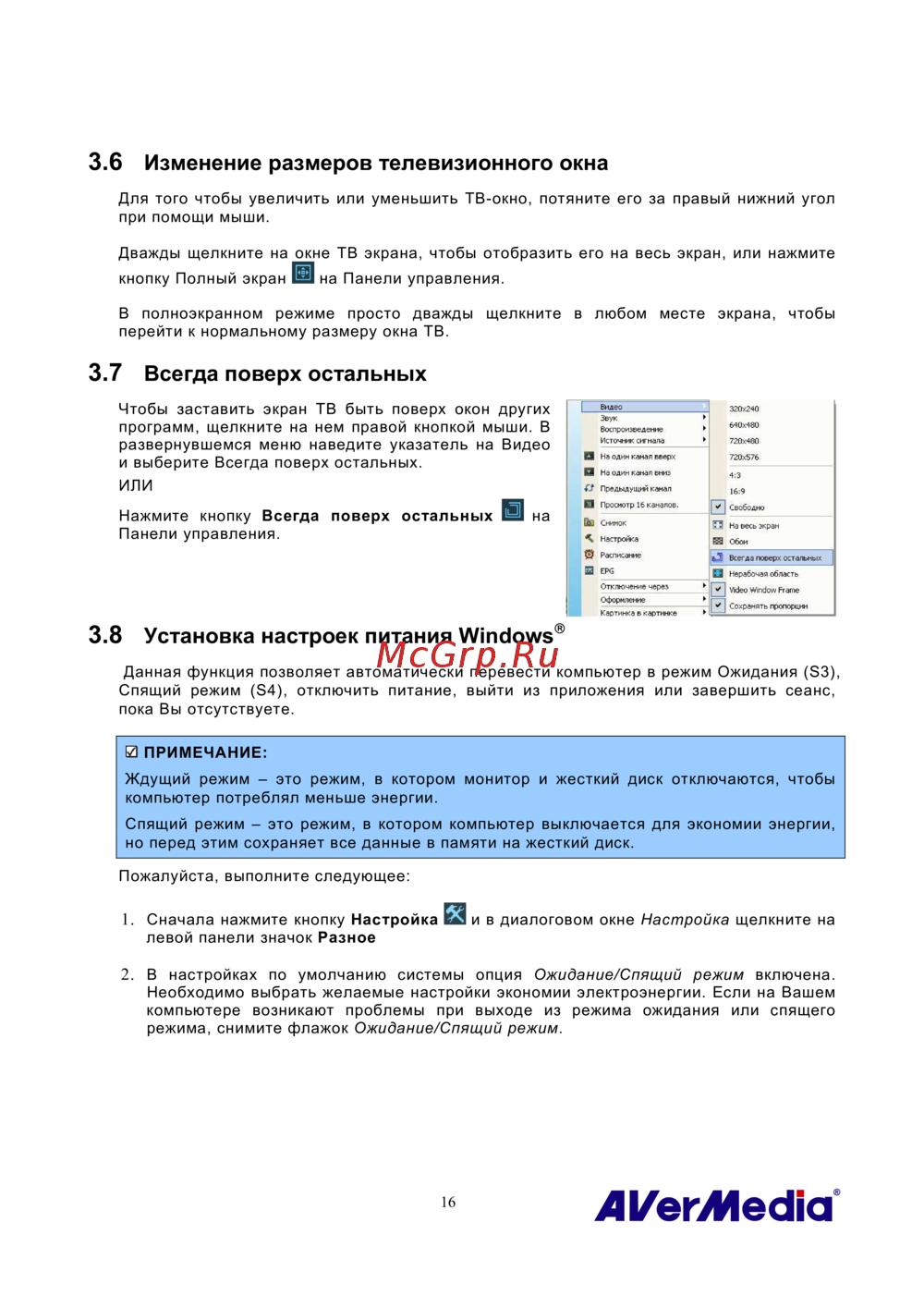 Aver Media TV Volar AX — как изменить размеры телевизионного окна и настройки питания [20/76]