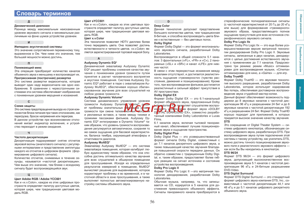 д Динамический диапазон Разница между максимальным неискаженным уровнем звукового сигнала и минимальным раз личимым на фоне шумов устройства уровнем И П Понижающий микс Эта операция преобразует количество каналов объемного звука к меньшему и воспроизводит их Прогрессивная построчная развертка Это система развертки видеосигнала которая выводит один кадр видеосигнала как одно изо бражение В сравнении с чересстрочными си стемами эта система обеспечивает изображение с пониженным уровнем мерцания и искажений С Схема защиты Это система предотвращения выхода из строя ком понентов блока питания при таких отклонениях как перегрузка бросок напряжения или перегрев В данном устройстве при возникновении откло нений мигает индикатор включения и устрой ство переходит в режим ожидания Ч Частота дискретизации Дискретизация подразумевает снятие отсчетов звуковой волны аналогового сигнала с регуляр ными интервалами и представление амплитуды каждого из отсчетов в цифровом формате фор мирование цифрового сигнала Количество отсчетов снимаемых в течение се кунды называется частотой дискретизации Чем выше это значение тем ближе к исходному сигналу будет воспроизводящийся звук Ц Цвет Adobe RGB Adobe YCC601 Как и x v Color каждое из этих цифровых про странств определяет палитру доступных цветов которая шире чем традиционная цветовая мо дель RGB D Deep Color Данная технология допускает представление большего количества цветов чем традиционная 8 битная и способна воспроизводить цвета бли же к естественным без цветовых полос Dolby Digital Формат Dolby Digital это формат многоканаль ного звукового сигнала разработанный Dolby Laboratories Воспроизводится в общей сложности 5 1 кана лов 3 фронтальных FL FR и С 2 пано рамных SL и SR и канал LFE для ниж них частот В связи с этим перекрестные искажения между каналами отсутствуют и достигается реалистич ность ощущения трехмерности чувство рас стояния движения и позиционирования Кроме того при воспроизведении фильмов достигается реалистичный и сильный эффект присутствия в AV пространствах Dolby Digital EX Формат Dolby Digital EX это 6 1 канальный формат объемного звука предложенный Dolby Laboratories Он позволяет слушателям воспро изводить у себя дома формат звука DOLBY DIGITAL SURROUND EX совместно разрабо танный компаниями Dolby Laboratories и Lucas Films 6 1 каналов звука включая тыловой панорам ный канал обеспечивают лучшее позициониро вание звука и ощущение пространства Dolby Digital Plus Dolby Digital Plus это усовершенствованный формат сигнала Dolby Digital совместимый с до 7 1 каналов дискретного цифрового звука а также повышающий качество звучания благода ря повышенной скорости передачи данных Он обратно совместим с традиционным Dolby Digi tal и таким образом предоставляет более гиб кую реакцию на сигнал источника и состояние устройства воспроизведения Dolby Pro Logic II Формат Dolby Pro Logic II это матричная тех нология декодирования разработанная Dolby Laboratories Обычная музыка например та что записы вается на CD кодируется в 5 каналов для до стижения превосходного объемного эффекта Сигналы панорамного канала преобразуются в А Audyssey Dynamic EQ Динамический эквалайзер Audyssey Dynamic EQ решает проблемы снижения качества зву чания с понижением уровня громкости путем принятия в расчет человеческого восприятия и акустики помещения Система Audyssey Dy namic EQ работает в паре с эквалайзером Au dyssey MultEQ обеспечивая хорошо сбалан сиров