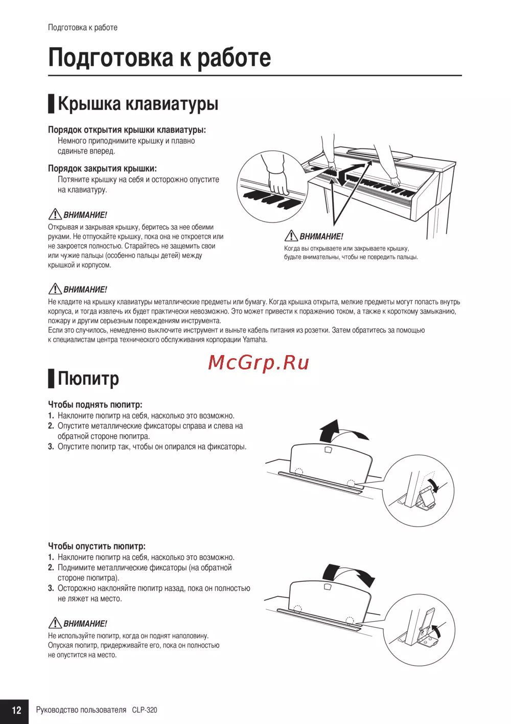 Подготовка к работе Подготовка к работе Крышка клавиатуры Порядок открытия крышки клавиатуры Немного приподнимите крышку и плавно сдвиньте вперед Порядок закрытия крышки Потяните крышку на себя и осторожно опустите на клавиатуру К ВНИМАНИЕ Открывая и закрывая крышку беритесь за нее обеими руками Не отпускайте крышку пока она не откроется или не закроется полностью Старайтесь не защемить свои или чужие пальцы особенно пальцы детей между крышкой и корпусом Когда вы открываете или закрываете крышку будьте внимательны чтобы не повредить пальцы ВНИМАНИЕ Не кладите на крышку клавиатуры металлические предметы или бумагу Когда крышка открыта мелкие предметы могут попасть внутрь корпуса и тогда извлечь их будет практически невозможно Это может привести к поражению током а также к короткому замыканию пожару и другим серьезным повреждениям инструмента Если это случилось немедленно выключите инструмент и выньте кабель питания из розетки Затем обратитесь за помощью к специалистам центра технического обслуживания корпорации Yamaha Пюпитр Чтобы поднять пюпитр 1 Наклоните пюпитр на себя насколько это возможно 2 Опустите металлические фиксаторы справа и слева на обратной стороне пюпитра 3 Опустите пюпитр так чтобы он опирался на фиксаторы Чтобы опустить пюпитр 1 Наклоните пюпитр на себя насколько это возможно 2 Поднимите металлические фиксаторы на обратной стороне пюпитра 3 Осторожно наклоняйте пюпитр назад пока он полностью не ляжет на место Л ВНИМАНИЕ Не используйте пюпитр когда он поднят наполовину Опуская пюпитр придерживайте его пока он полностью не опустится на место 12 Руководство пользователя CLP 320