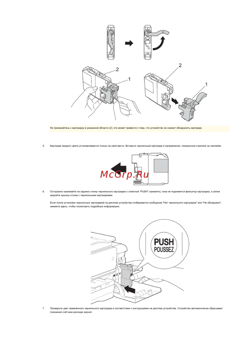6. Осторожно нажимайте на заднюю стенку чернильного картриджа с отметкой “PUSH” (нажмите), пока не поднимется фиксатор картриджа, а затем