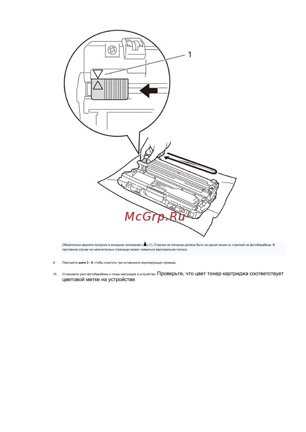 10. Установите узел фотобарабана и тонер-картриджа в устройство. Проверьте, что цвет тонер-картриджа соответствует