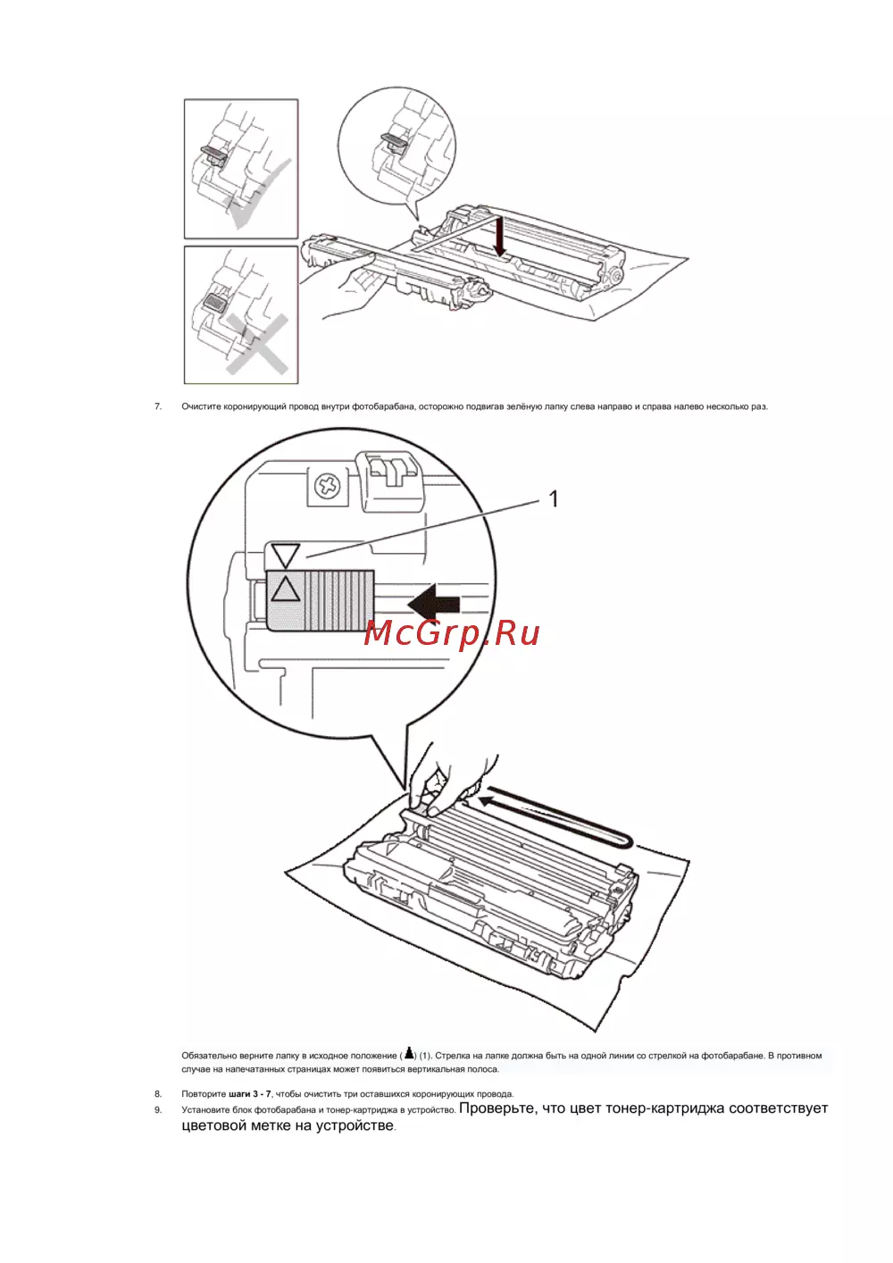 Узнайте, как очистить коронирующие провода фотобарабана и правильно установить тонер-картридж для предотвращения полос на печати. Подробные шаги и советы.