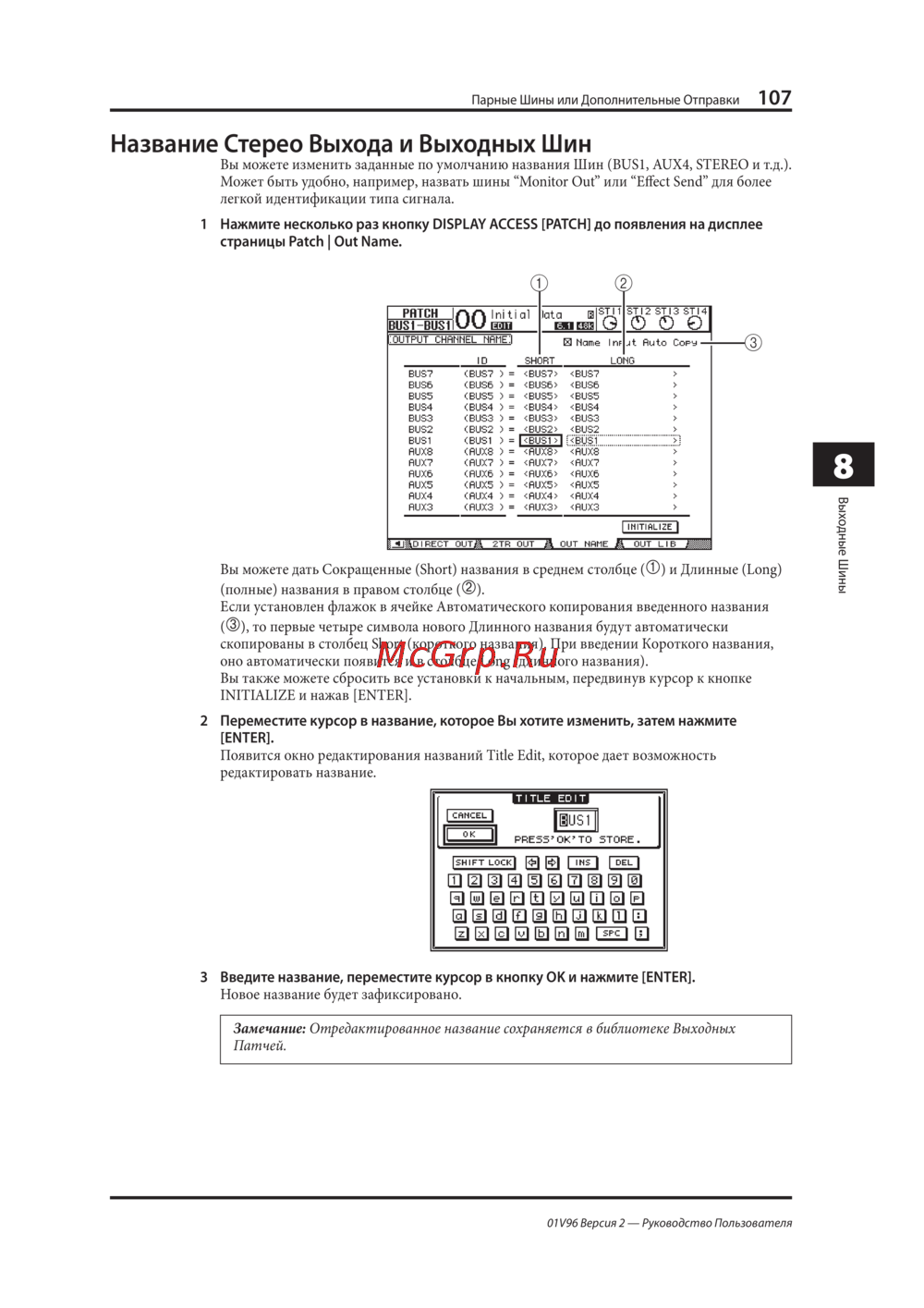 Yamaha 01V96VCM — изменение названий выходных шин в аудиосистеме [105/320]