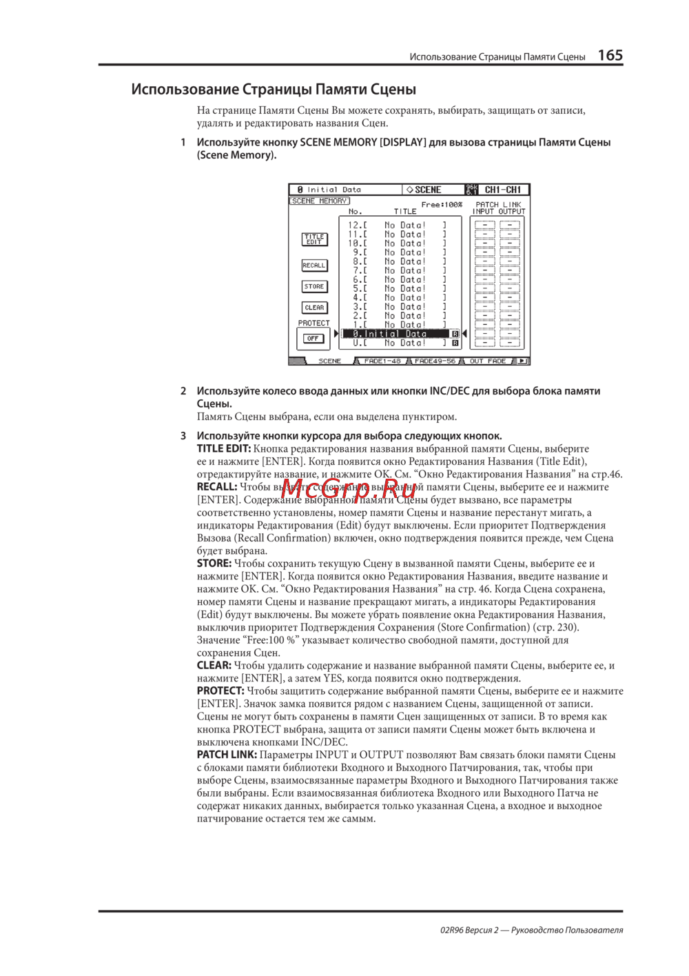 Yamaha 02R96VCM — управление сценами в системе памяти: сохранение, редактирование, защита и удаление [165/341]