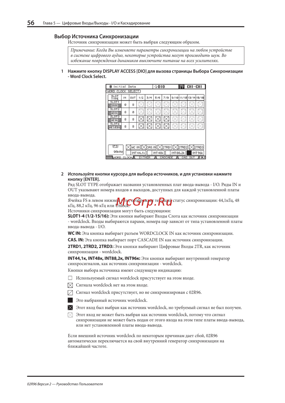 Инструкция по выбору источника синхронизации (Word Clock) в системе цифрового аудио. Управление синхронизацией, каскадирование, поддержка внешних и внутренних генераторов сигнала.
