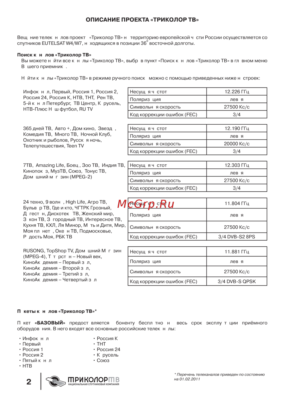 - Вещание телеканалов проекта триколор тв на территорию европейской части россии осуществляется со спутников eutelsat w4 w7 находящихся в позиции 36 p.10