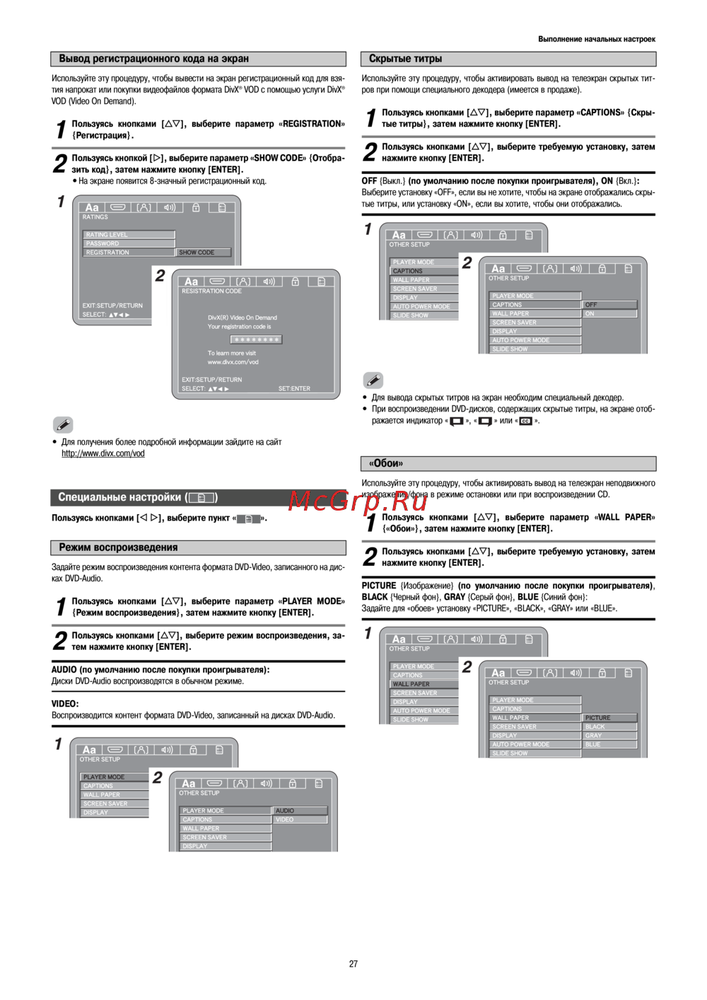 Узнайте, как вывести регистрационный код и настроить режимы воспроизведения на вашем проигрывателе. Подробные инструкции по активации скрытых титров и обоев.
