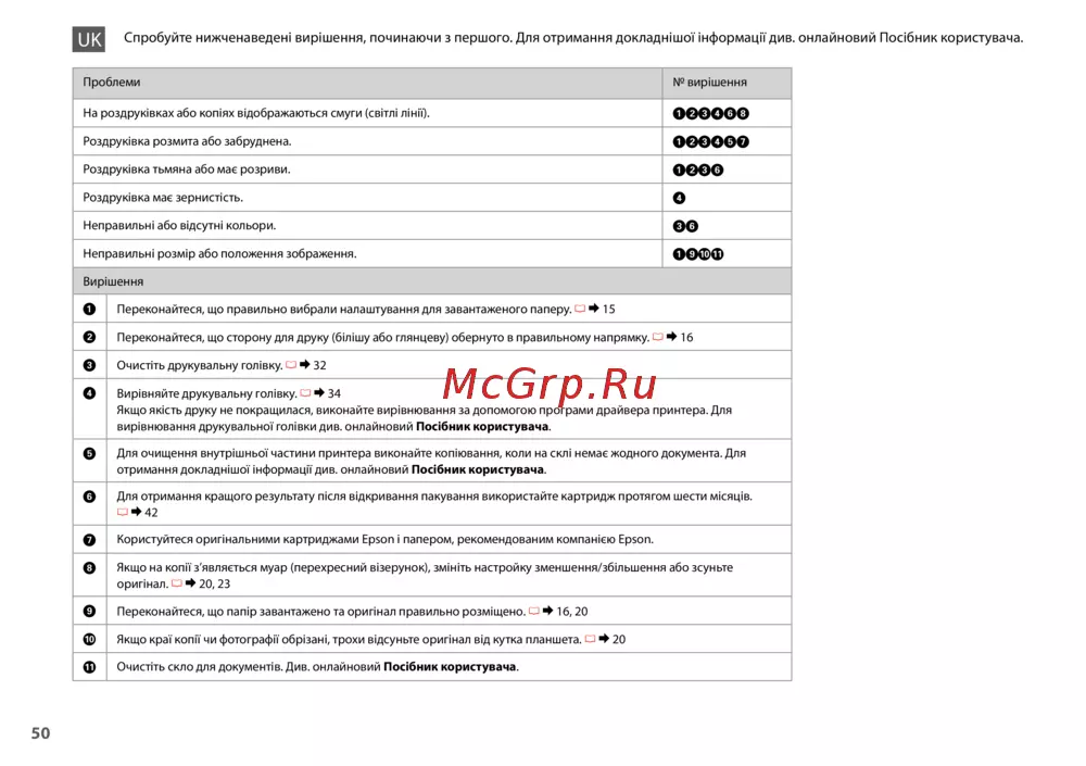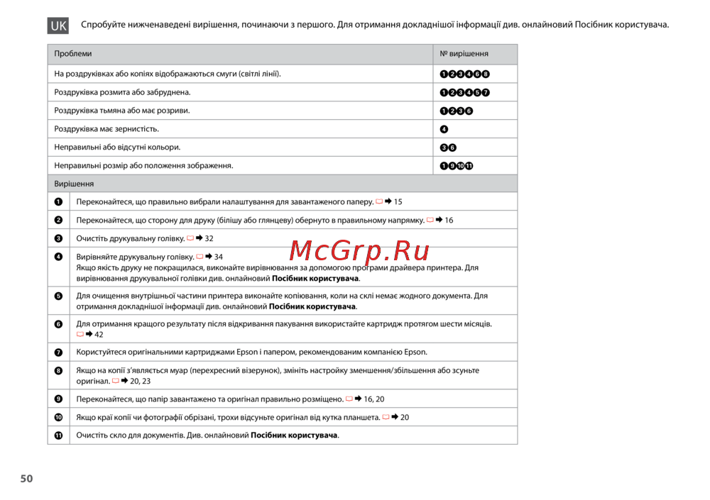 - Спробуйте нижченаведені вирішення починаючи з першого для отримання докладнішої інформації див онлайновий посібник користувача p.50