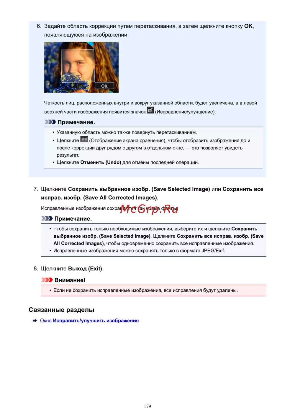 • Исправленные изображения можно сохранять только в формате JPEG/Exif.