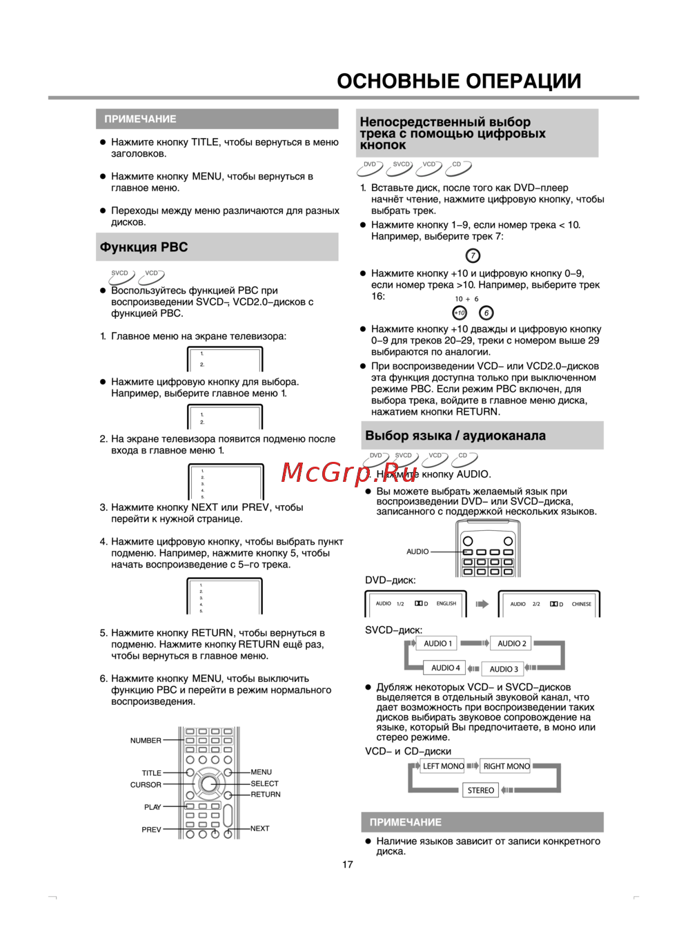 ОСНОВНЫЕ ОПЕРАЦИИ ПРИМЕЧАНИЕ Нажмите кнопку TITLE чтобы вернуться в меню заголовков Нажмите кнопку MENU чтобы вернуться в главное меню Переходы между меню различаются для разных дисков Непосредственный выбор трека с помощью цифровых кнопок 1 Вставьте диск после того как 070 плеер начнёт чтение нажмите цифровую кнопку чтобы выбрать трек Нажмите кнопку 1 9 если номер трека 10 Например выберите трек 7 Функция РВС Воспользуйтесь функцией РВС при воспроизведении SVCD УС02 0 дисков с функцией РВС 1 Главное меню на экране телевизора Г 1 Нажмите цифровую кнопку для выбора Например выберите главное меню 1 Г 1 2 На экране телевизора появится подменю после входа в главное меню 1 Нажмите кнопку 10 и цифровую кнопку 0 9 если номер трека 10 Например выберите трек 16 ю б О Нажмите кнопку 10 дважды и цифровую кнопку 0 9 для треков 20 29 треки с номером выше 29 выбираются по аналогии При воспроизведении VCD или УСО2 0 дисков эта функция доступна только при выключенном режиме РВС Если режим РВС включен для выбора трека войдите в главное меню диска нажатием кнопки RETURN Выбор языка аудиоканала 1 Нажмите кнопку AUDIO 3 Нажмите кнопку NEXT или PREV чтобы перейти к нужной странице Вы можете выбрать желаемый язык при воспроизведении DVD или SVCD диска записанного с поддержкой нескольких языков 4 Нажмите цифровую кнопку чтобы выбрать пункт подменю Например нажмите кнопку 5 чтобы начать воспроизведение с 5 го трека 5 Нажмите кнопку RETURN чтобы вернуться в подменю Нажмите кнопку RETURN ещё раз чтобы вернуться в главное меню 6 Нажмите кнопку MENU чтобы выключить функцию РВС и перейти в режим нормального воспроизведения Дубляж некоторых VCD и SVCD дисков выделяется в отдельный звуковой канал что дает возможность при воспроизведении таких дисков выбирать звуковое сопровождение на языке который Вы предпочитаете в моно или стерео режиме VCD и CD диски f LEFTMQNo ш RIGHT MONO STEREO ПРИМЕЧАНИЕ Наличие языков зависит от записи конкретного диска