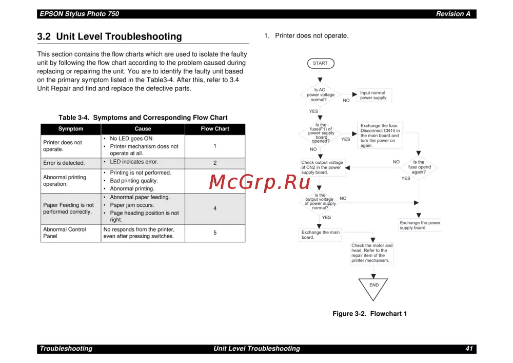 Epson Stylus Photo 750 [46/114] This section contains the flow charts which are used to isolate the faulty unit by following the flow chart according to the problem caused during replacing or repairin...