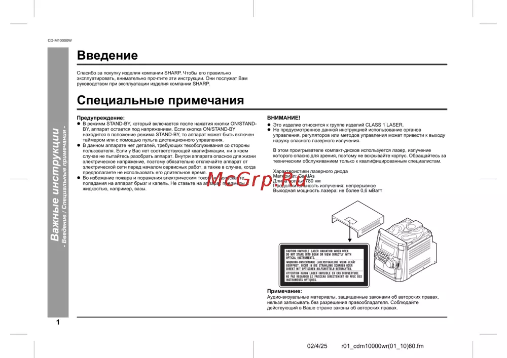 Sharp CD-M10000W — инструкции по эксплуатации аудиопроигрывателя с лазерным излучением [4/36]