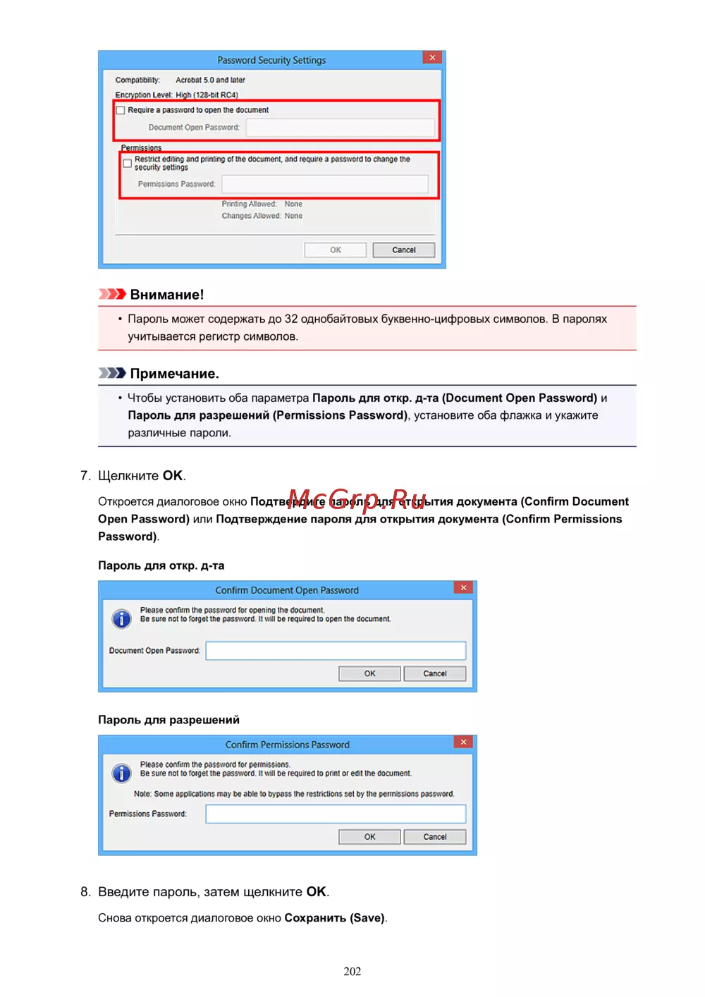 - Диалоговое окно параметры защиты с помощью пароля p.315