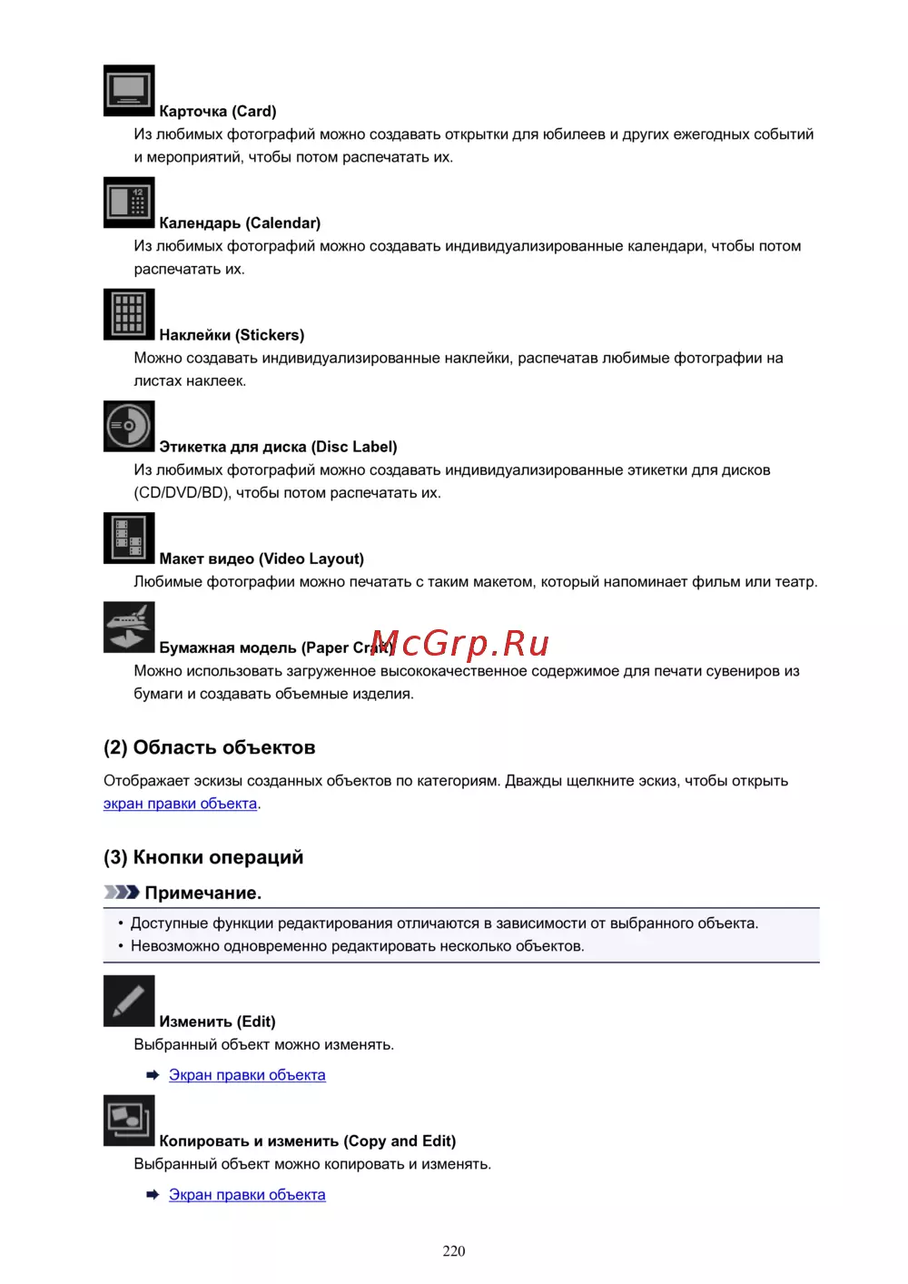 • Доступные функции редактирования отличаются в зависимости от выбранного объекта.