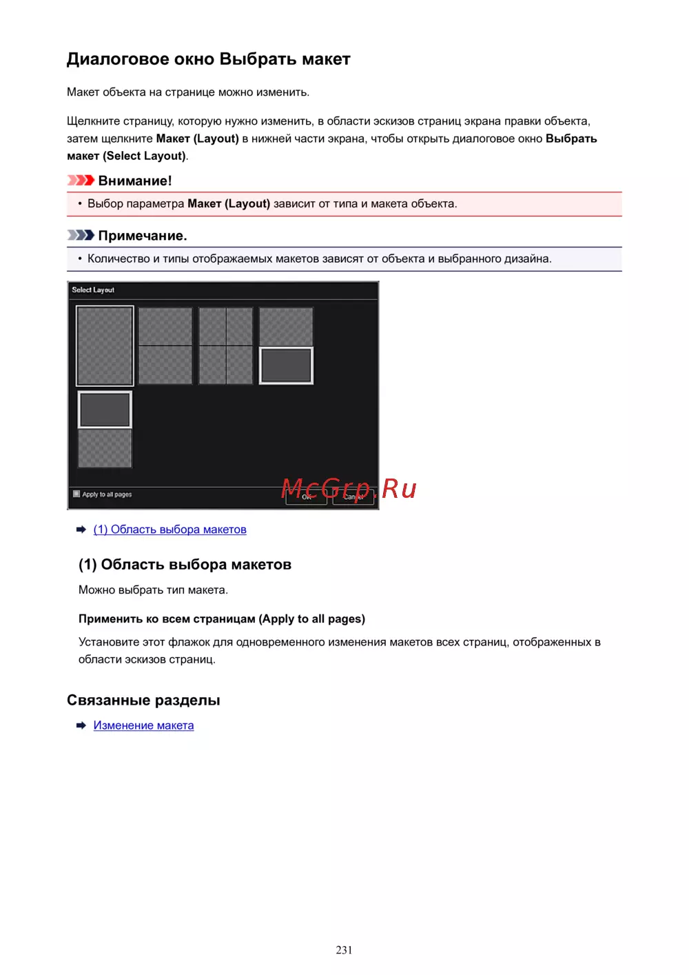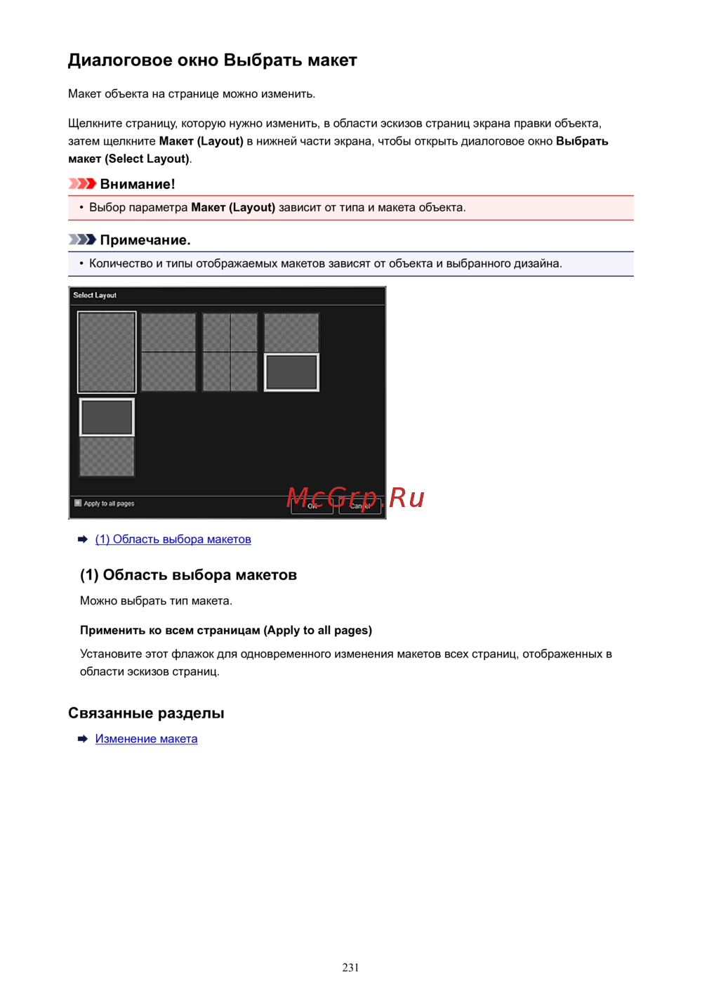 Диалоговое окно Выбрать макет