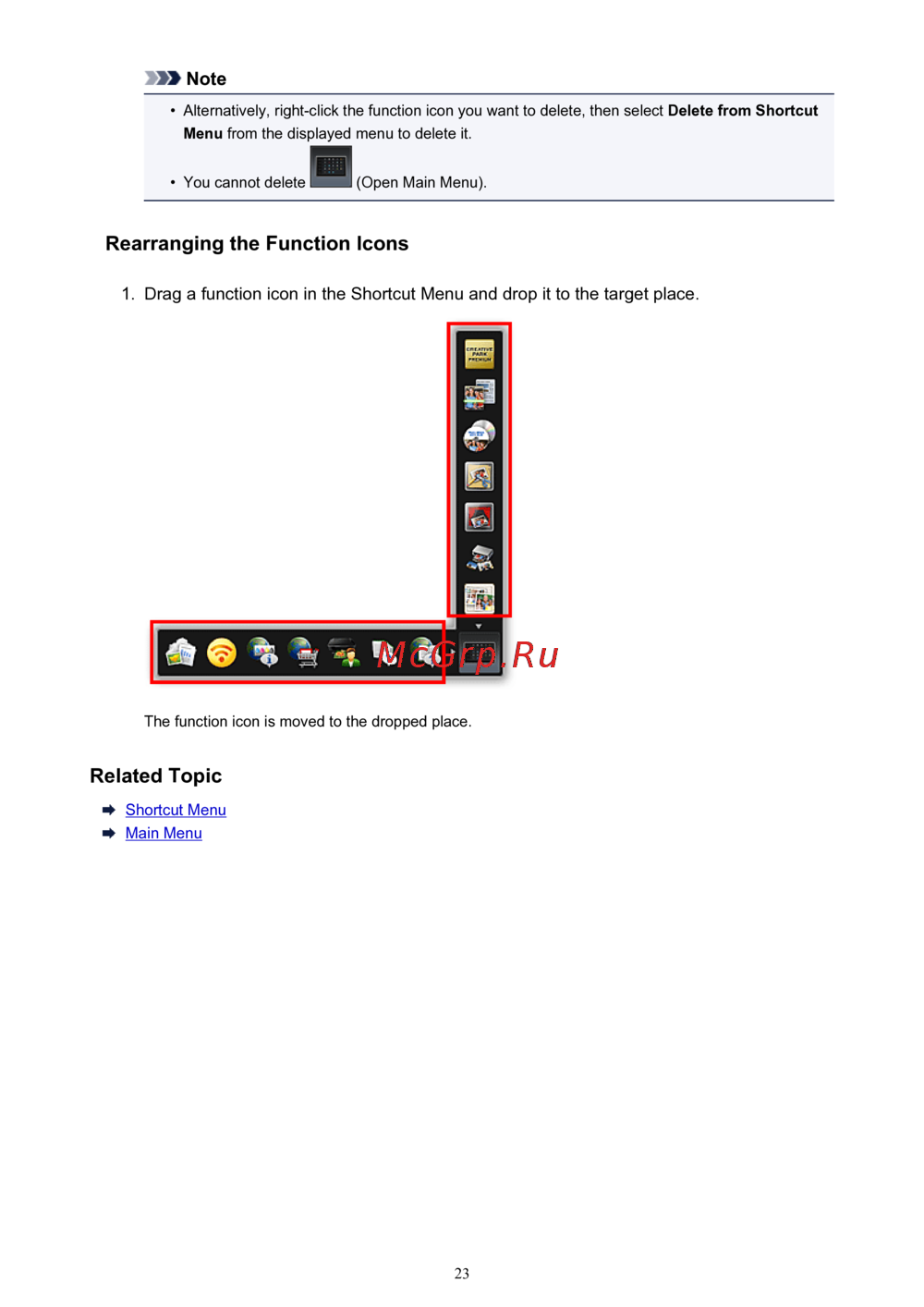 - Drag the function icon you want to delete and drop it outside the shortcut menu area p.22