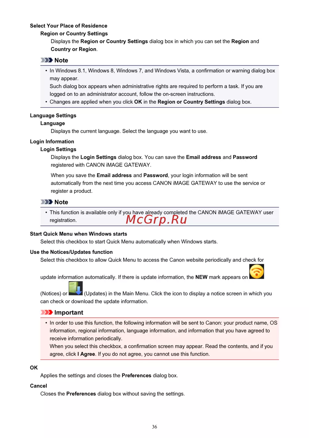 • In order to use this function, the following information will be sent to Canon: your product name, OS