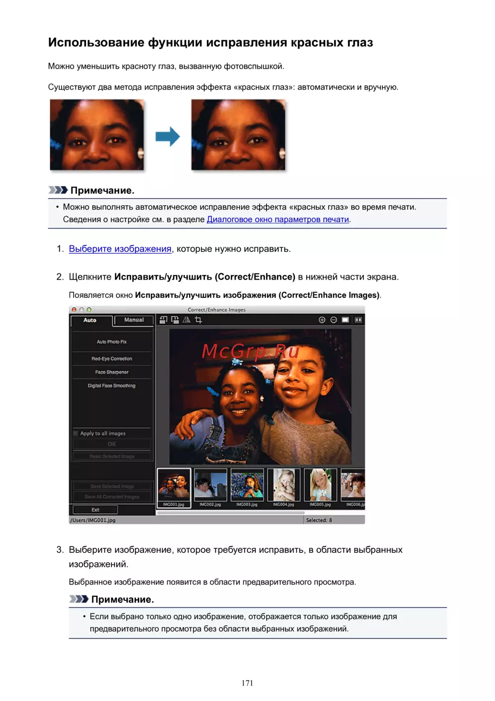 • Можно выполнять автоматическое исправление эффекта «красных глаз» во время печати.