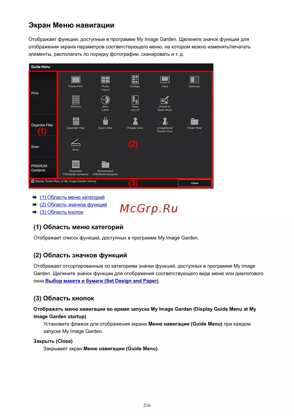 Отображать меню навигации во время запуска My Image Garden (Display Guide Menu at My