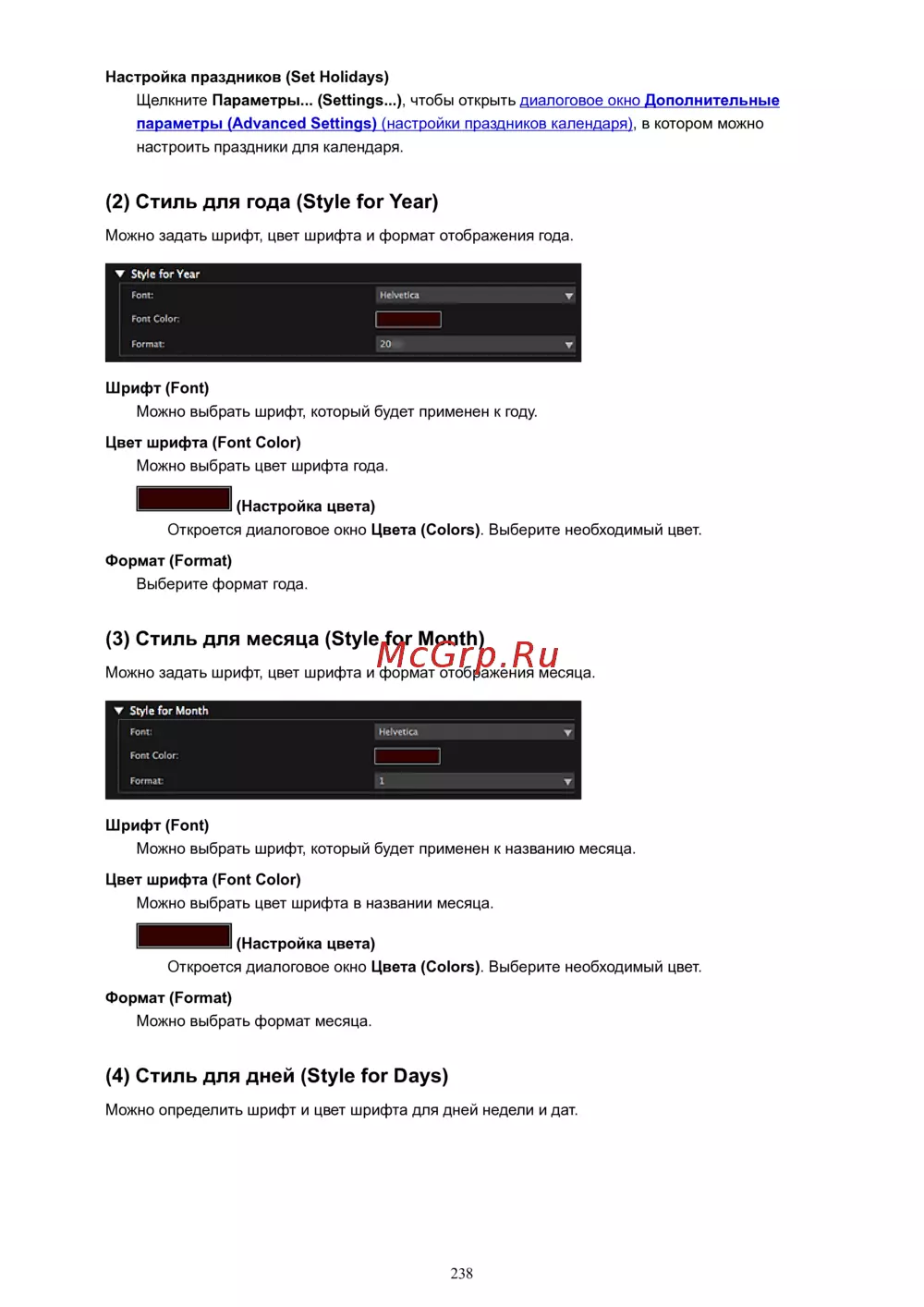 Можно определить шрифт и цвет шрифта для дней недели и дат.
