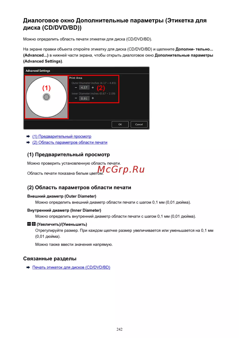Можно определить область печати этикетки для диска (CD/DVD/BD).