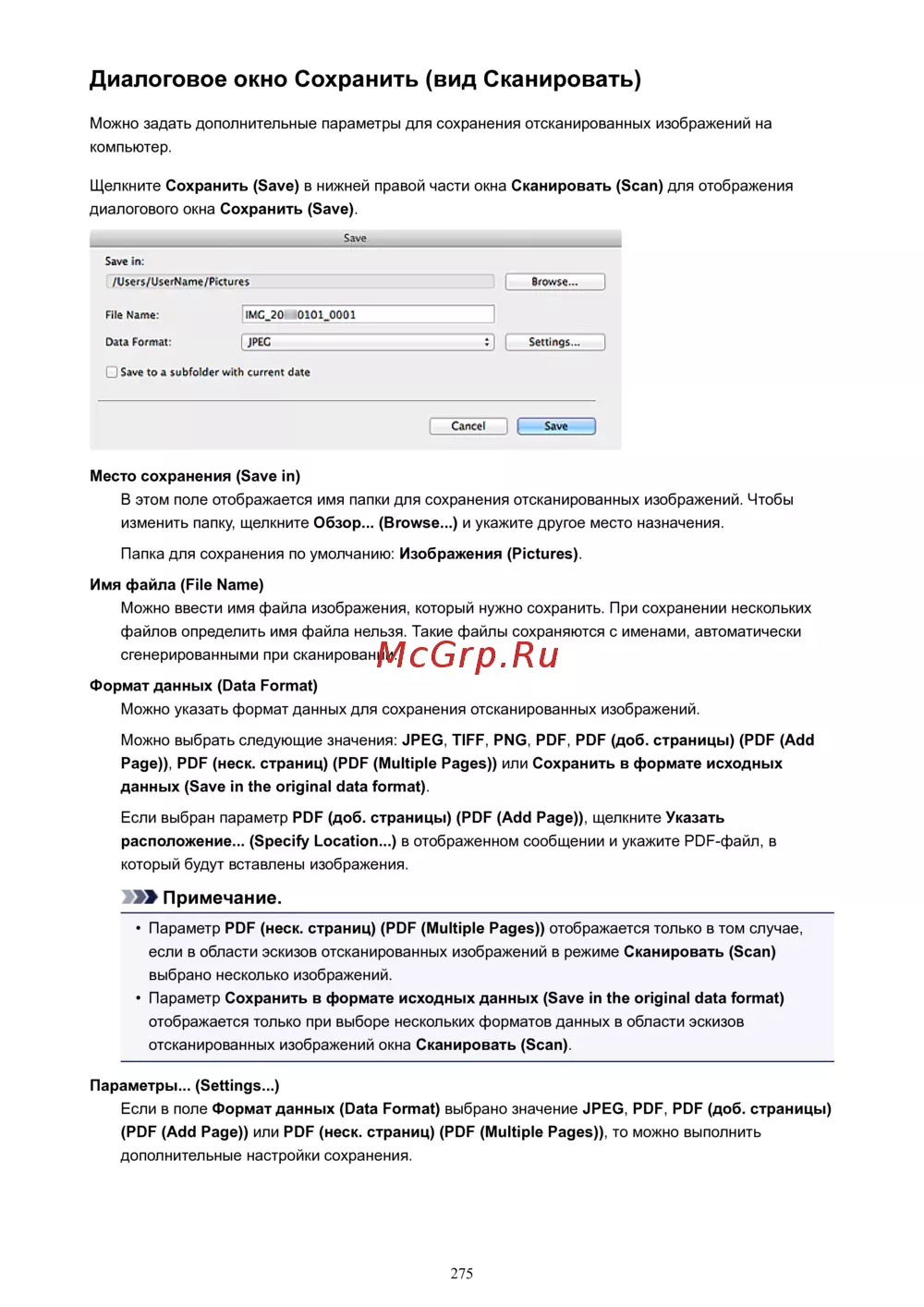 • Параметр PDF (неск. страниц) (PDF (Multiple Pages)) отображается только в том случае,