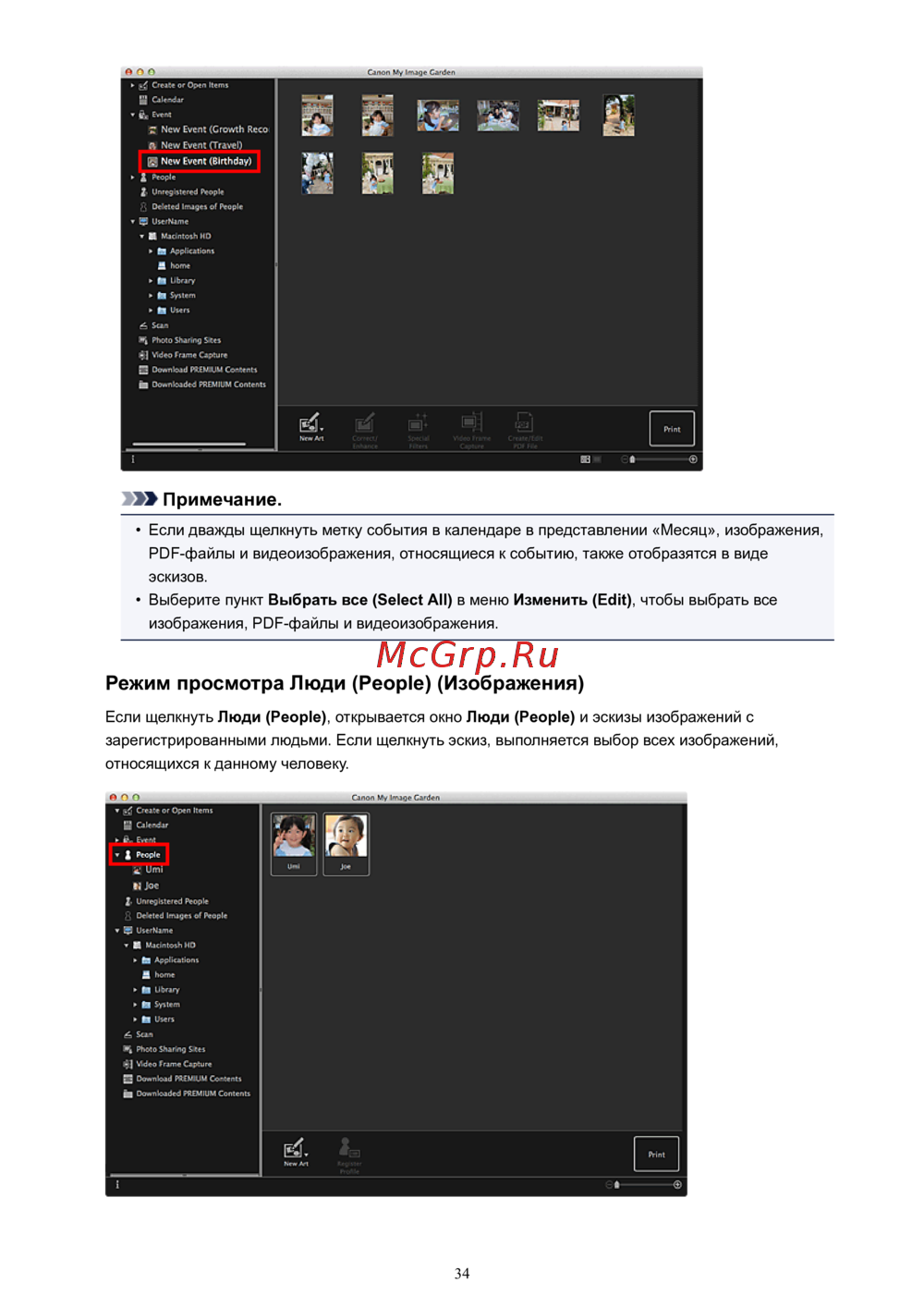 Если щелкнуть Люди (People), открывается окно Люди (People) и эскизы изображений с