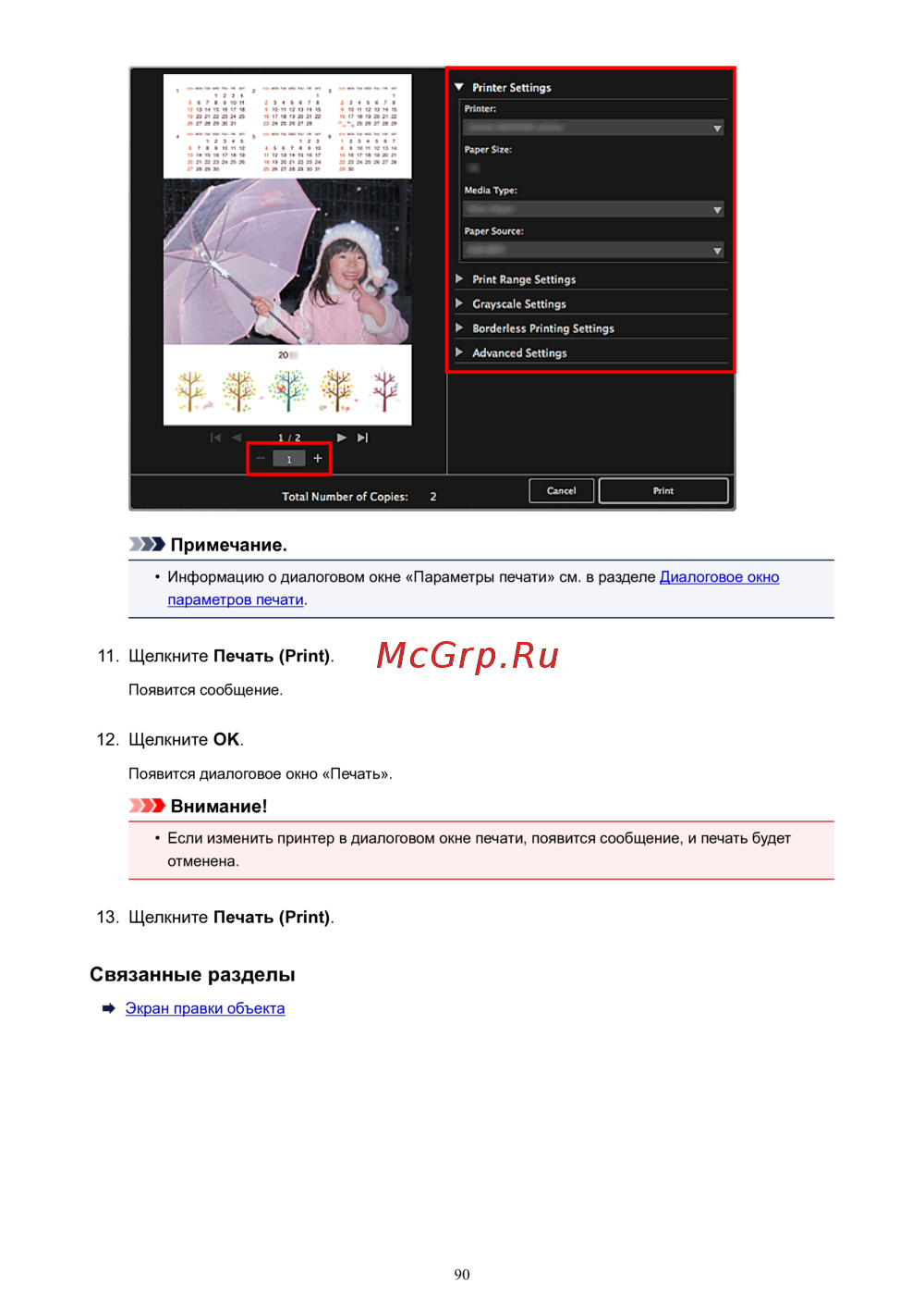 • Информацию о диалоговом окне «Параметры печати» см. в разделе Диалоговое окно