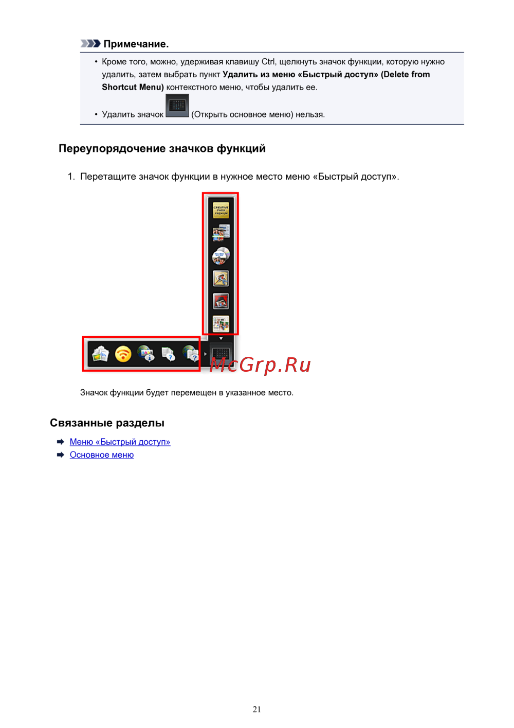 - Перетащите значок функции в нужное место меню быстрый доступ p.21