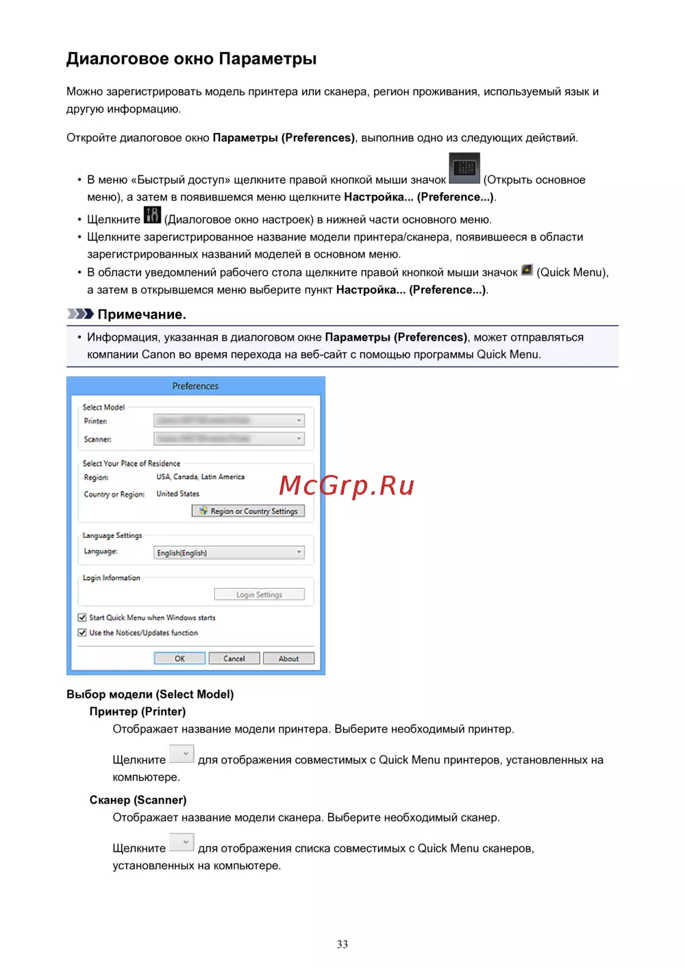 Узнайте, как зарегистрировать принтер или сканер, выбрать регион и язык, а также получить доступ к настройкам через диалоговое окно Параметры.