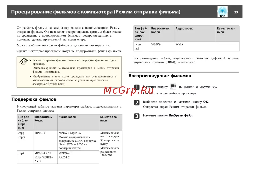 Однако некоторые проекторы могут не поддерживать файлы фильмов.
