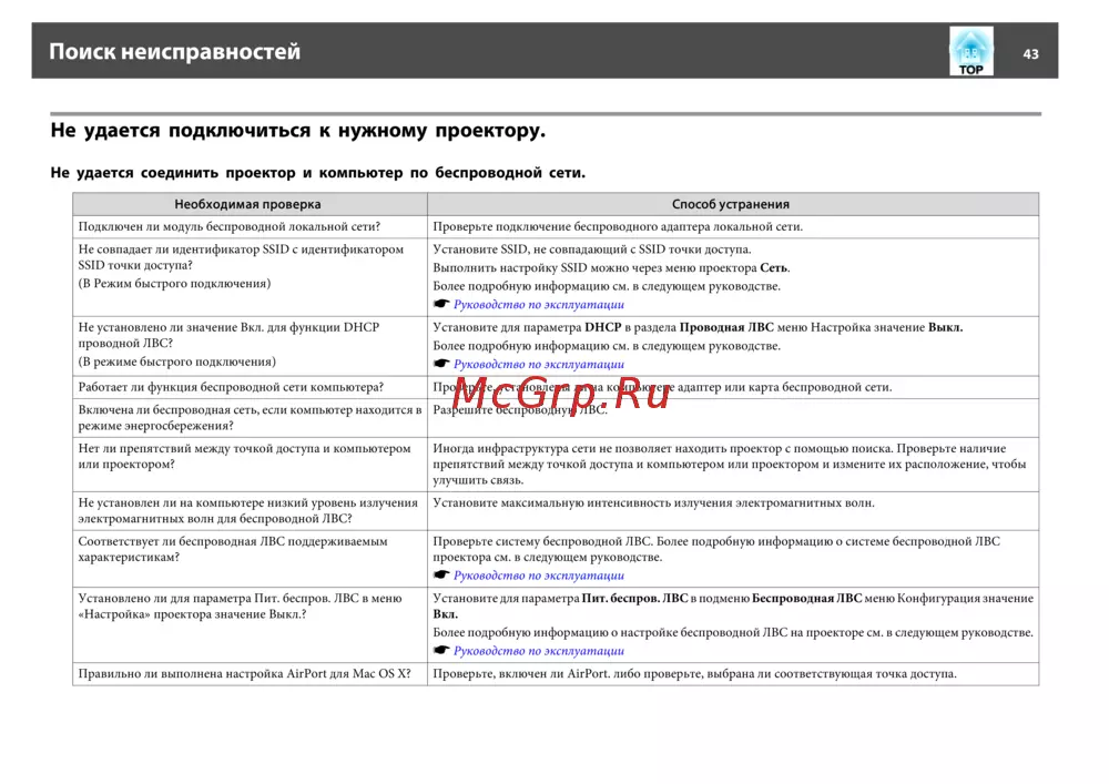 - Не удается соединить проектор и компьютер по беспроводной сети p.43