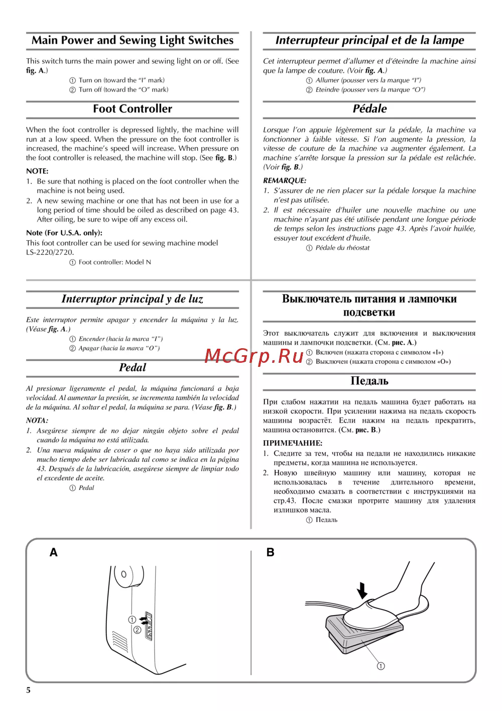 Узнайте, как правильно использовать выключатели питания и педаль швейной машины для управления скоростью и освещением. Полезные советы по обслуживанию.