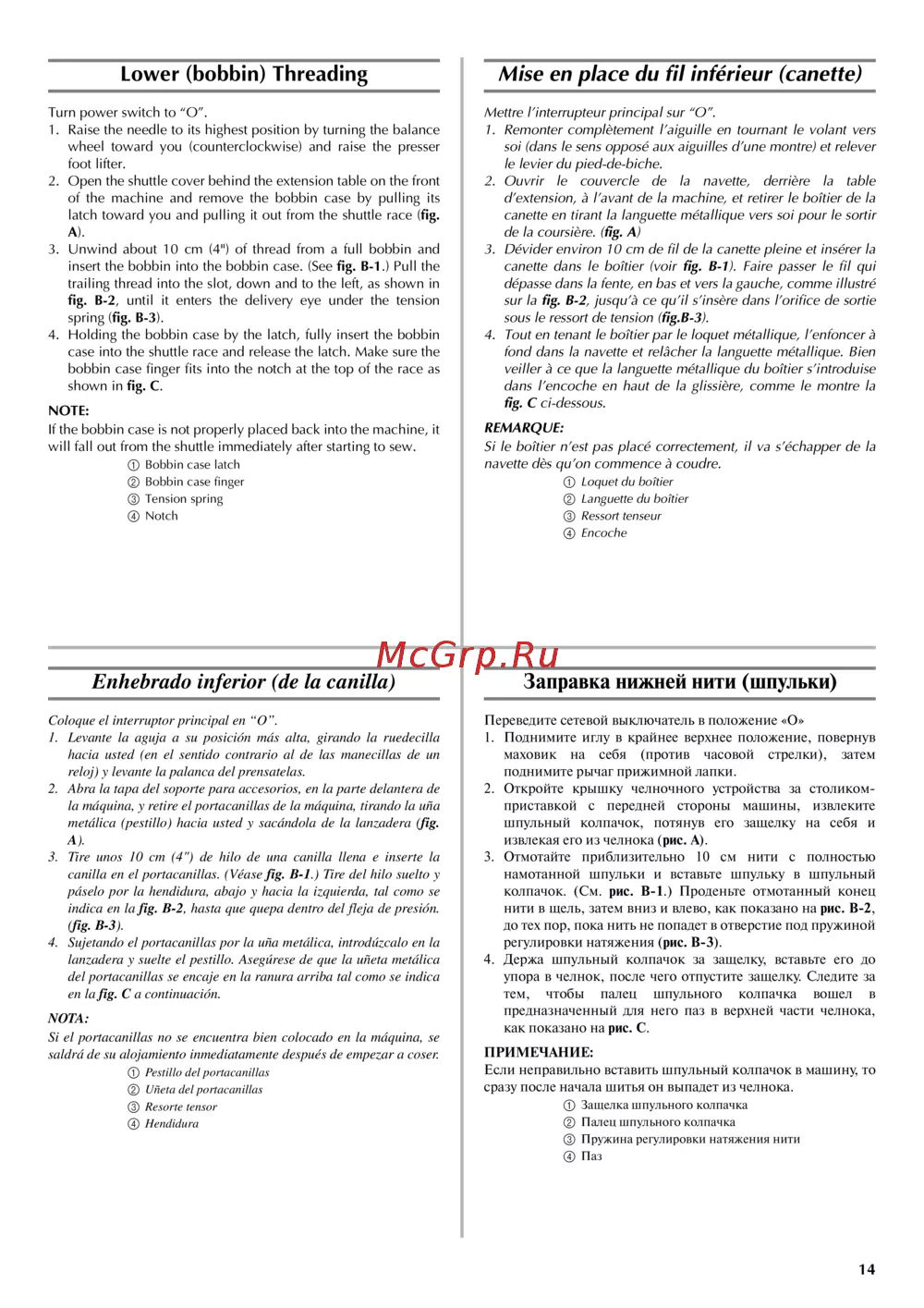 Полное пошаговое руководство по заправке нижней нити (шпульки) на швейной машине с поддержкой русского, английского, французского, немецкого и испанского языков. Включает инструкции по правильной установке шпульки и предупреждения.