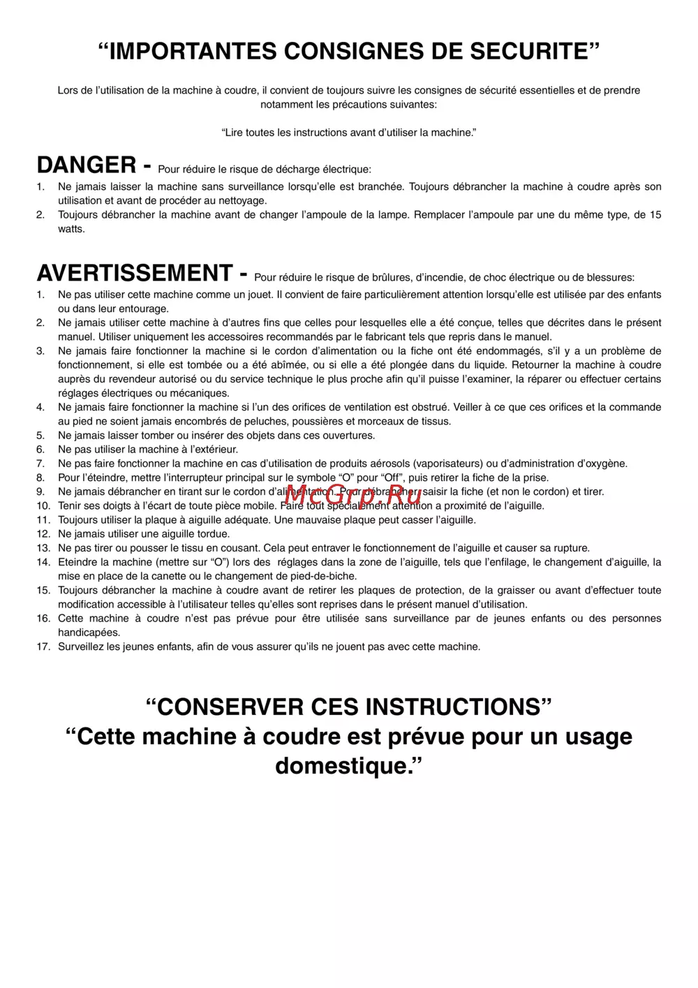 - Conserver ces instructions cette machine à coudre est prévue pour un usage domestique p.4