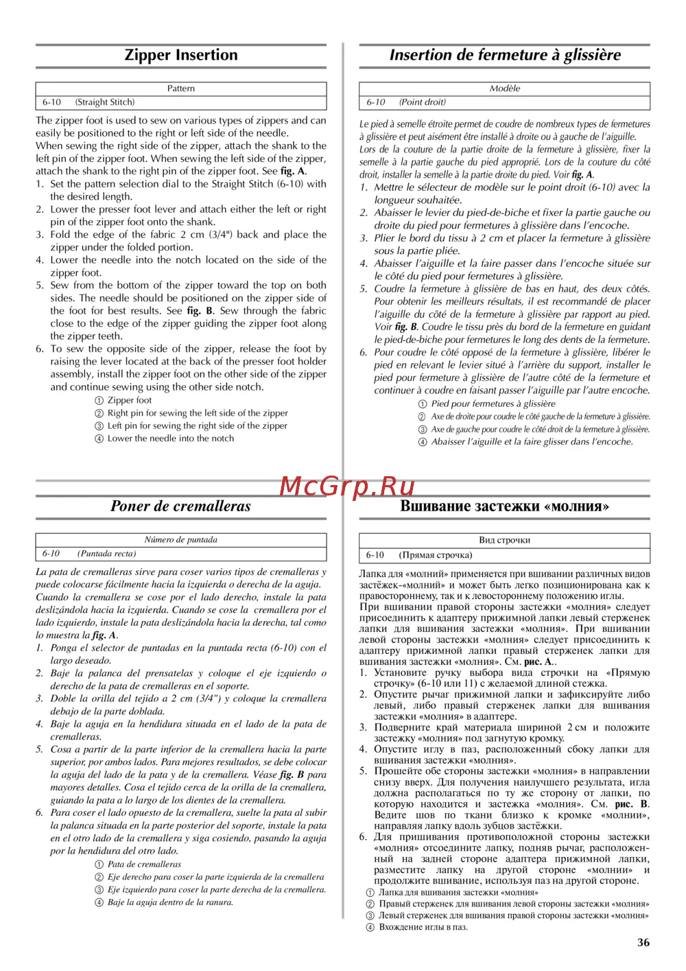 attach the shank to the right pin of the zipper foot. See fig. A.