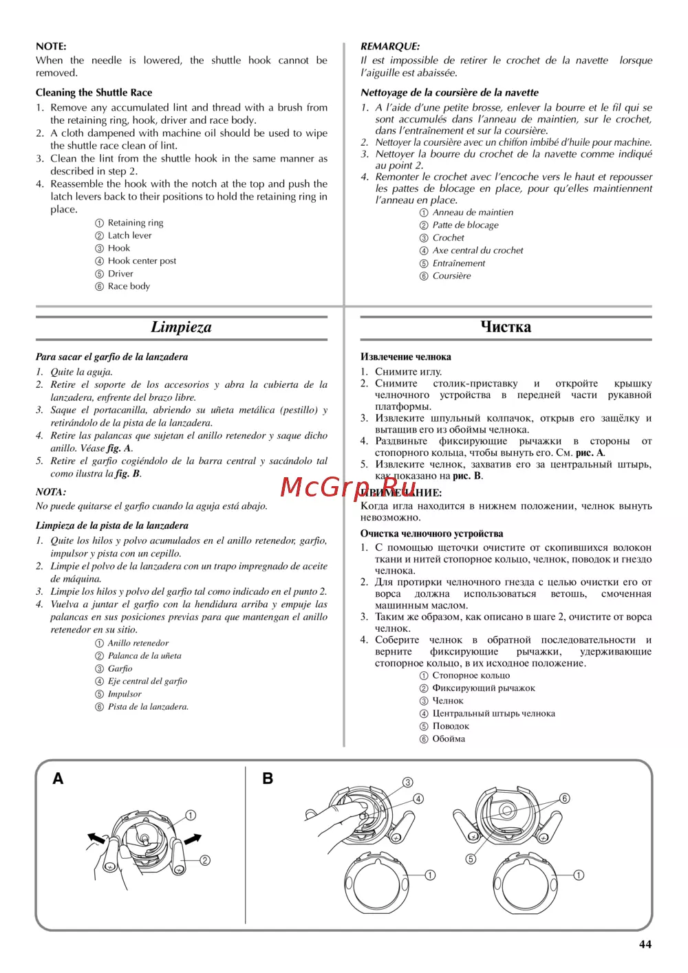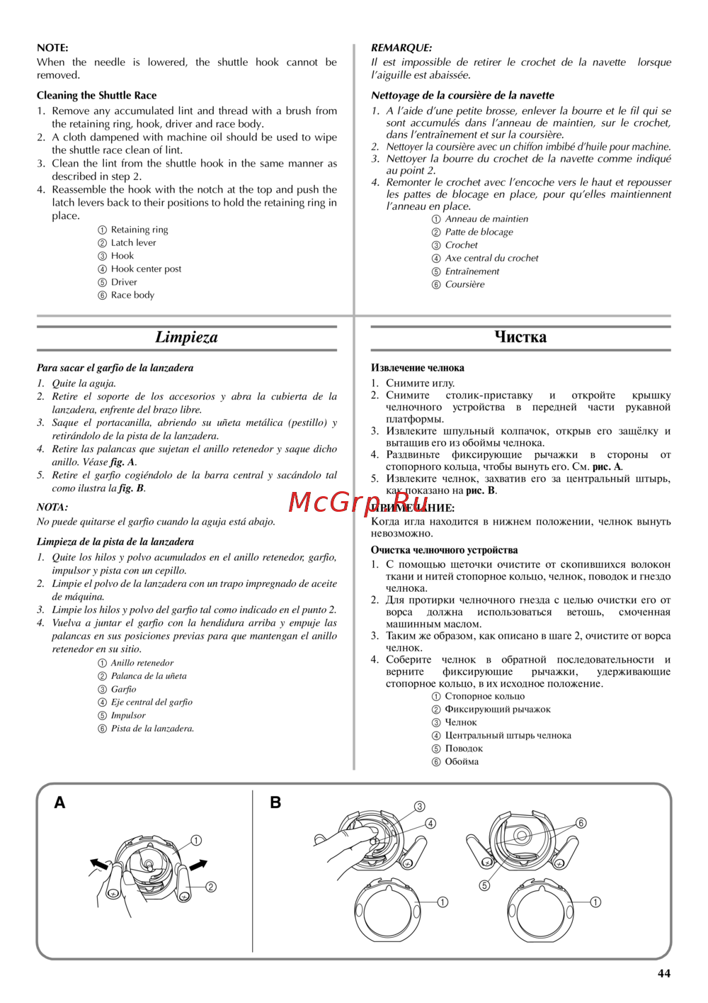 3. Limpie los hilos y polvo del garfio tal como indicado en el punto 2.