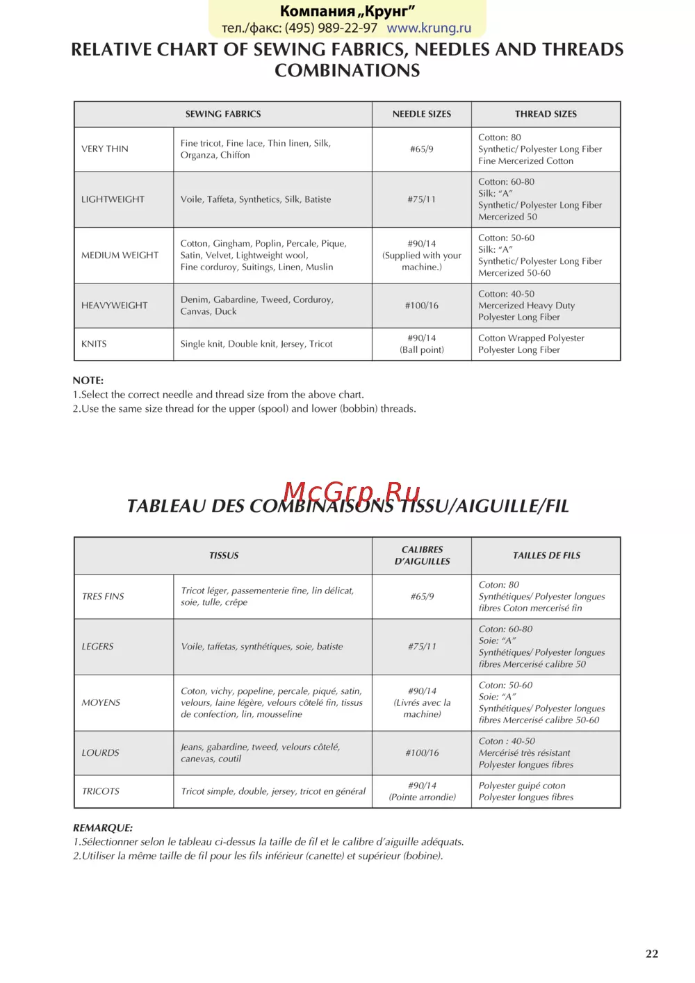 1.Sélectionner selon le tableau ci-dessus la taille de fil et le calibre d’aiguille adéquats.