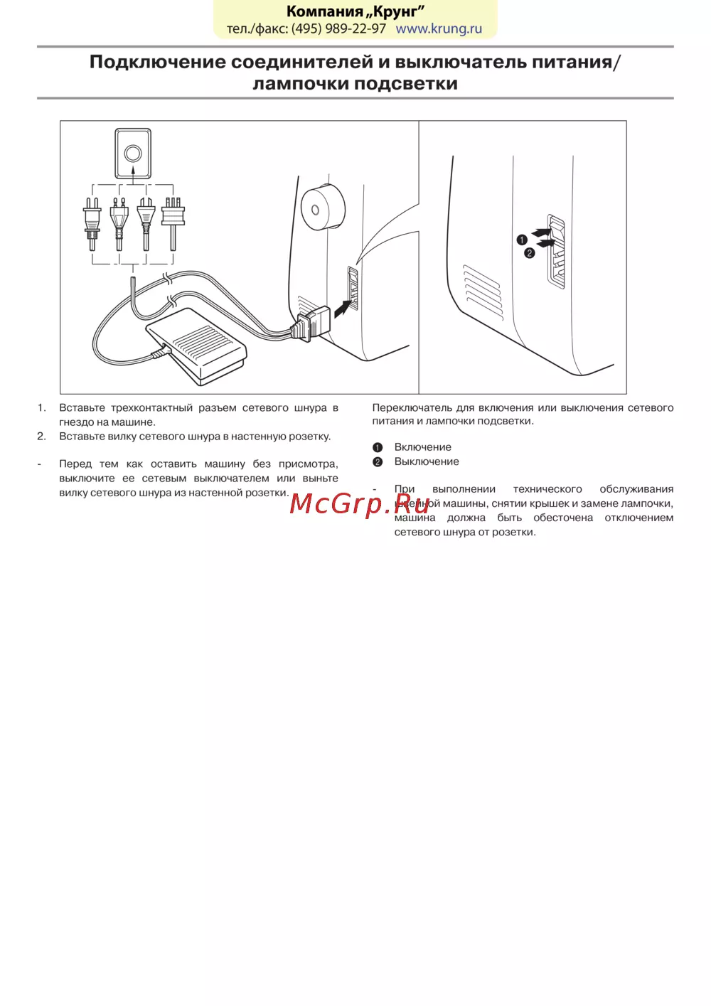 Инструкция по обесточиванию швейной машины с использованием выключателя и лампочки подсветки. Важно для обслуживания и безопасности при ремонте.