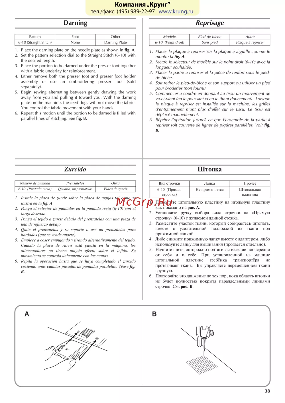 1. Place the darning plate on the needle plate as shown in fig. A.