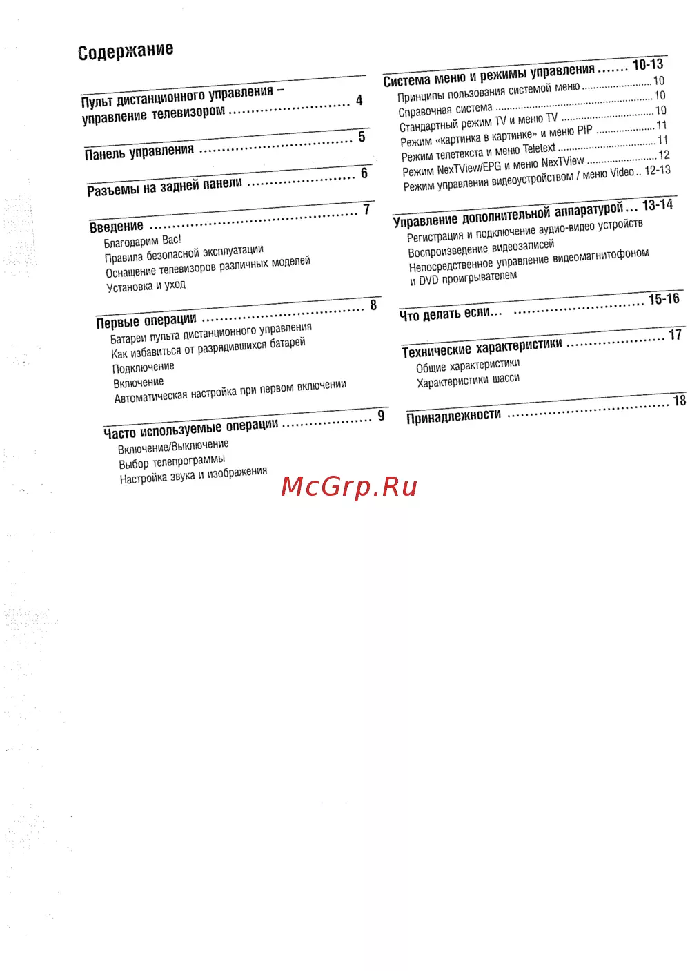 Содержание Пульт дистанционного управления РежимЫ УПРа 9ИЯ 10 принципы пользования системой меню 4 Справочная система ю управление телевизором ___ ________________ _______77777Т77Г Стандартный режим ТУ и меню W п Режим картинка в картинке и меню п Панель управления________ _________ Разъемы на задней панели Введение Благодарим Вас И DVD Проигрывателем Установка и уход _____________________ Что делать если TSTT 15 16 _ __________ ___ Технические характеристики и Как избавься от оззодавшозоя батареи 17 ш Общие характеристики Подключение Характеристики шасси XX ТП8 9 Принадлежности Часто используемые операции 11 Включение Выкяючение Выбор телепрограммы Настройка звука и изображения