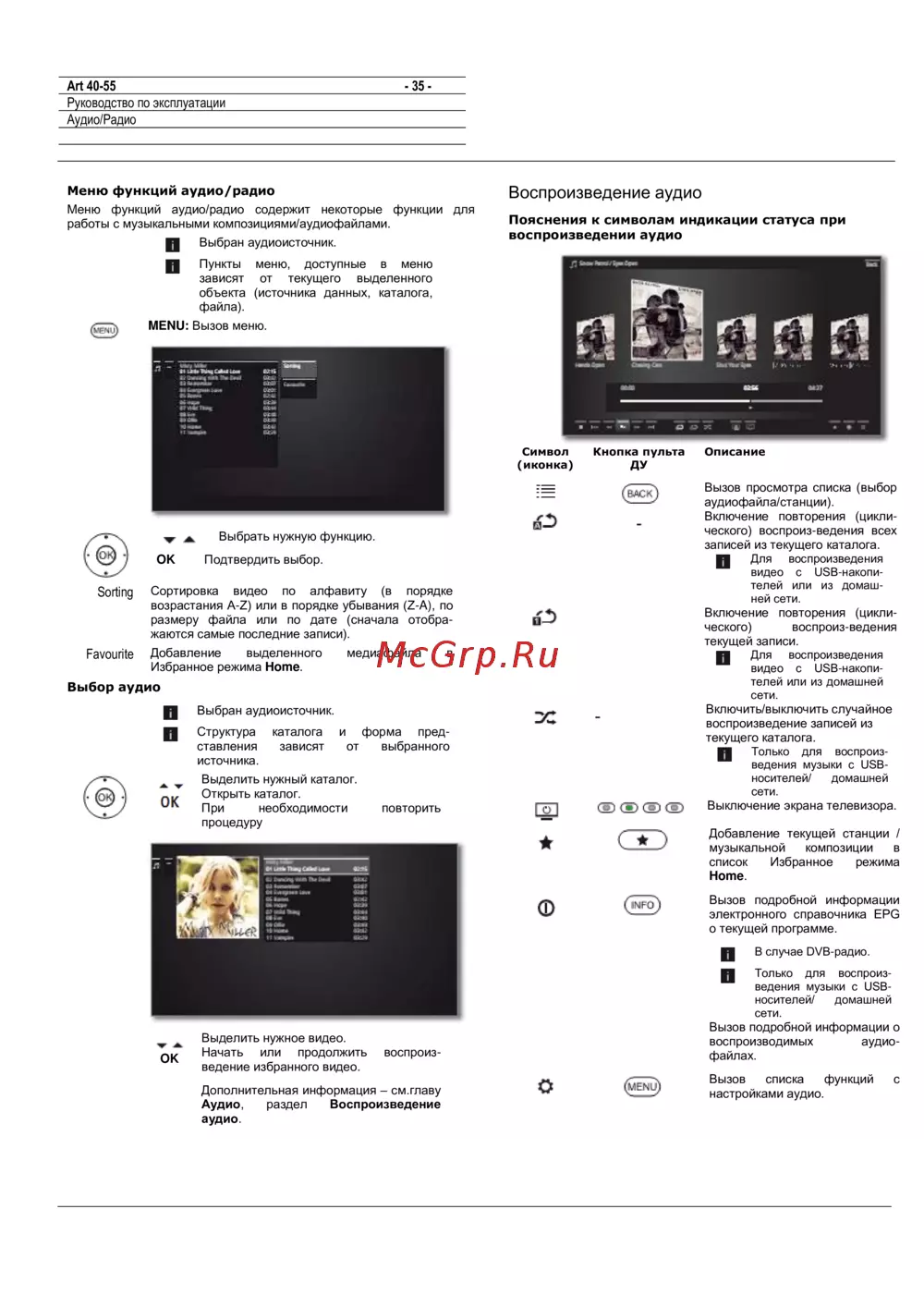 Изучите функции меню аудио и радио, включая сортировку, воспроизведение и добавление в Избранное. Узнайте, как управлять аудиофайлами и видеофайлами.