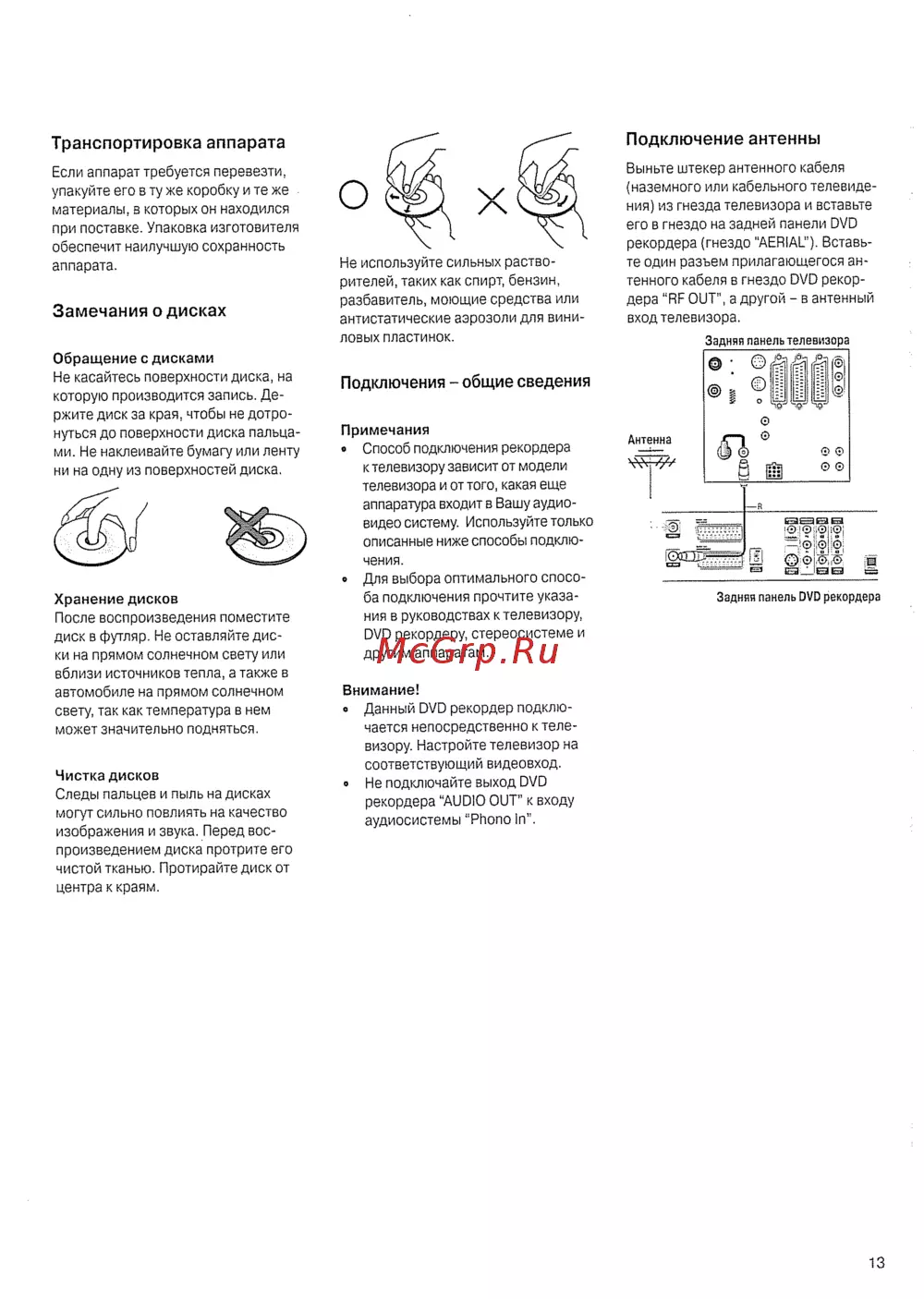 Транспортировка аппарата Подключение антенны Если аппарат требуется перевезти упакуйте его в ту же коробку и те же материалы в которых он находился при поставке Упаковка изготовителя обеспечит наилучшую сохранность аппарата Выньте штекер антенного кабеля наземного или кабельного телевиде ния из гнезда телевизора и вставьте его в гнездо на задней панели DVD рекордера гнездо AERIAL Вставь те один разъем прилагающегося ан тенного кабеля в гнездо DVD рекор дера RFOUT а другой в антенный вход телевизора Замечания о дисках Обращение с дисками Не касайтесь поверхности диска на которую производится запись Де ржите диск за края чтобы не дотро нуться до поверхности диска пальца ми Не наклеивайте бумагу или ленту ни на одну из поверхностей диска Хранение дисков После воспроизведения поместите диск в футляр Не оставляйте дис ки на прямом солнечном свету или вблизи источников тепла а также в автомобиле на прямом солнечном свету так как температура в нем может значительно подняться Чистка дисков Следы пальцев и пыль на дисках могут сильно повлиять на качество изображения и звука Перед вос произведением диска протрите его чистой тканью Протирайте диск от центра к краям Не используйте сильных раство рителей таких как спирт бензин разбавитель моющие средства или антистатические аэрозоли для вини ловых пластинок Задняя панель телевизора Подключения общие сведения Примечания о Способ подключения рекордера к телевизору зависит от модели телевизора и от того какая еще аппаратура входит в Вашу аудио видео систему Используйте только описанные ниже способы подклю чения Для выбора оптимального спосо ба подключения прочтите указа ния в руководствах к телевизору DVD рекордеру стереосистеме и другим аппаратам Антенна Задняя панель DVD рекордера Внимание о Данный DVD рекордер подклю чается непосредственно к теле визору Настройте телевизор на соответствующий видеовход о Не подключайте выход DVD рекордера AUDIO OUT к входу аудиосистемы Phono In 13