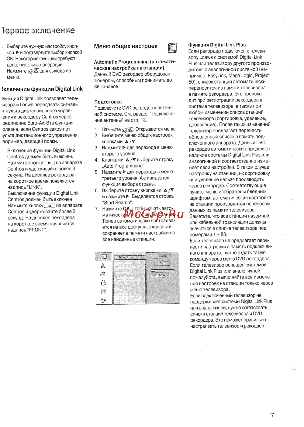 1ервое включение Выберите нужную настройку кноп кой и подтвердите выбор кнопкой ОК Некоторые функции требуют дополнительных операций Нажмите для выхода из меню включение функции Digital Link функция Digital Link позволяет теле изорам Loewe передавать сигналы т пульта дистанционного управ ения к рекордеру Centros через юединение Euro AV Эта функция юлезна если Centros закрыт от ульта дистанционного управления юпример дверцей полки Включение функции Digital Link Centros должен быть включен Нажмите кнопку в на аппарате Centros и удерживайте более 3 секунд На дисплее рекордера на короткое время появляется надпись LINK Выключение функции Digital Link Centros должен быть включен Нажмите кнопку Z O на аппарате Centros и удерживайте более 3 секунд На дисплее рекордера на короткое время появляется надпись FRONT Меню общих настроек Д Automatic Programming автомати ческая настройка на станции Данный DVD рекордер оборудован тюнером способным принимать до 88 каналов Подготовка Подключите DVD рекордер к антен ной системе См раздел Подключе ние антенны на стр 13 1 Нажмите Открывается меню 2 Выберите меню общих настроек кнопками A V 3 Нажмите для перехода в меню второго уровня 4 Кнопками А V выберите строку Auto Programming 5 Нажмите для перехода в меню третьего уровня Активируется функция выбора страны 6 Выберите страну кнопками A V и нажмите Выделяется строка Start Search 7 Нажмите ОК чтобы начать авто матическую настройку на станции Тюнер автоматически настраива ется на все доступные каналы и сохраняет в памяти настройки на все найденные станции Функция Digital Link Plus Если рекордер подключен к телеви зору Loewe с системой Digital Link Plus или телевизору другого произво дителя с аналогичной системой на пример EasyLink Mega Logic Project 50 список станций автоматически переносится из памяти телевизора в память рекордера Это происхо дит при регистрации рекордера в системе телевизора а также при любом изменении списка станций телевизора сортировка удаление добавление После таких изменений телевизор предлагает перенести обновленный список в память под ключенного аппарата Данный DVD рекордер автоматически определяет наличие системы Digital Link Plus или аналогичной и соответственно изме няет свои настройки В таком случае настройку на станции их сортировку или удаление нельзя производить через рекордер Соответствующие пункты меню изображены бледным шрифтом автоматическая настройка на станции производится переносом данных из памяти телевизора Заметьте что все станции наземной или кабельной трансляции должны значиться в списке телевизора под номерами 1 88 Если телевизор не предлагает пере нести настройки в память подключен ного аппарата нужно отдать такую команду через меню DVD рекордера Если телевизор оснащен системой Digital Link Plus или аналогичной пожалуйста выполняйте все измене ния настроек на станции только через меню телевизора Если подключенный телевизор не поддерживает системы Digital Link Plus или аналогичной нужно согласовать списки станций телевизора и DVD рекордера Это поможет правильно настраивать телевизор и рекордер 17