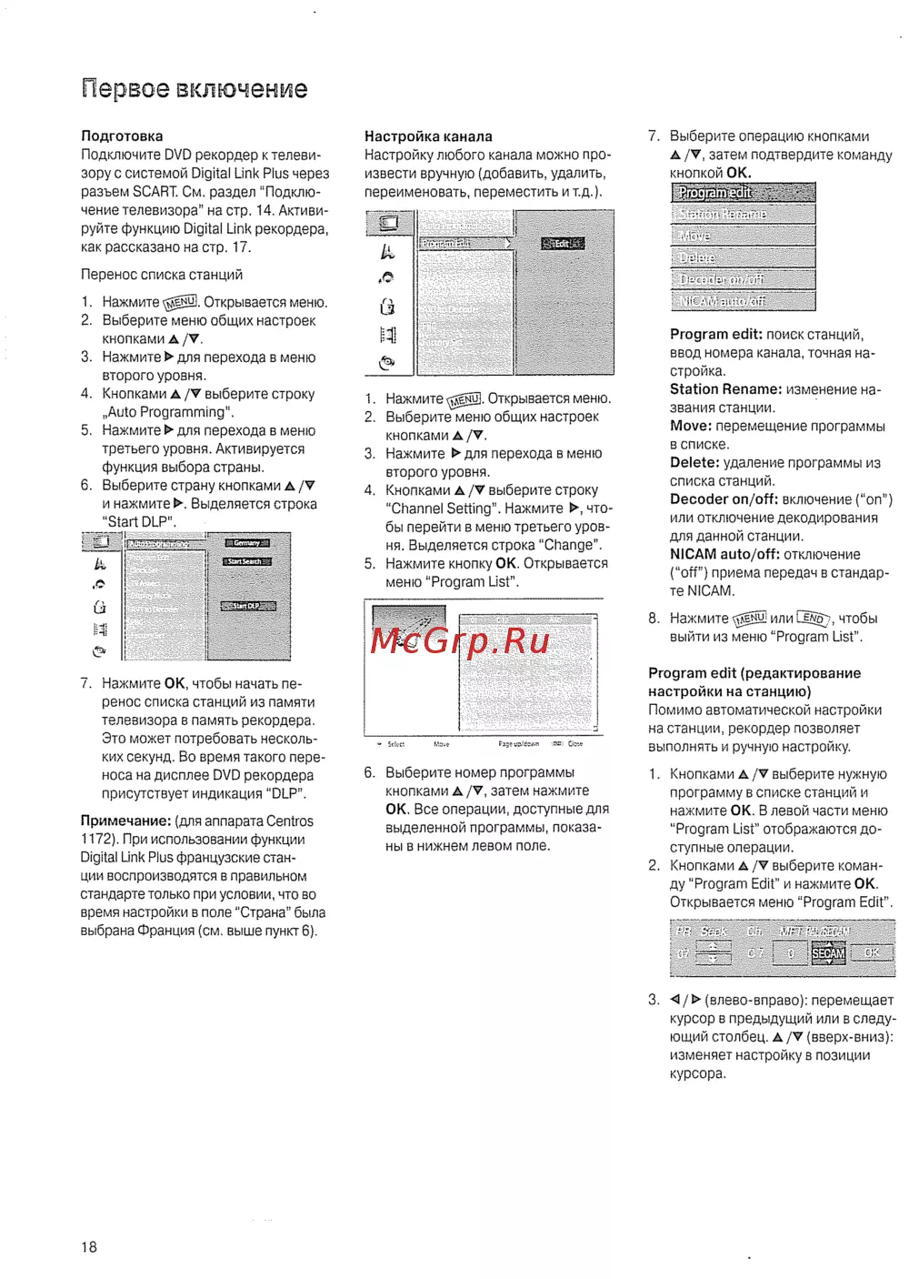 Первое включение Подготовка Подключите DVD рекордер к телеви зору с системой Digital Link Pius через разъем SCART См раздел Подклю чение телевизора на стр 14 Активи руйте функцию Digital Link рекордера как рассказано на стр 17 Настройка канала Настройку любого канала можно про извести вручную добавить удалить переименовать переместить и т д 7 Выберите операцию кнопками А V затем подтвердите команду кнопкой ОК Перенос списка станций 1 Нажмите Открывается меню 2 Выберите меню общих настроек кнопками А V 3 Нажмите для перехода в меню второго уровня 4 Кнопками А V выберите строку Auto Programming 5 Нажмите для перехода в меню третьего уровня Активируется функция выбора страны 6 Выберите страну кнопками А V и нажмите Выделяется строка 1 Нажмите 5 Открывается меню 2 Выберите меню общих настроек кнопками А V 3 Нажмите для перехода в меню второго уровня 4 Кнопками А V выберите строку Channel Setting Нажмите к что бы перейти в меню третьего уров ня Выделяется строка Change 5 Нажмите кнопку ОК Открывается меню Program List Program edit поиск станций ввод номера канала точная на стройка Station Rename изменение на звания станции Move перемещение программы в списке Delete удаление программы из списка станций Decoder on off включение on или отключение декодирования для данной станции N1CAM auto off отключение off приема передач в стандар те NICAM 8 Нажмитеили чтобы выйти из меню Program List 7 Нажмите ОК чтобы начать пе ренос списка станций из памяти телевизора в память рекордера Это может потребовать несколь ких секунд Во время такого пере носа на дисплее DVD рекордера присутствует индикация DLP Примечание для аппарата Centros 1172 При использовании функции Digital Link Plus французские стан ции воспроизводятся в правильном стандарте только при условии что во время настройки в поле Страна была выбрана Франция см выше пункт 6 Рз ь аглп sr Осл 6 Выберите номер программы кнопками д V затем нажмите ОК Все операции доступные для выделенной программы показа ны в нижнем левом поле Program edit редактирование настройки на станцию Помимо автоматической настройки на станции рекордер позволяет выполнять и ручную настройку 1 Кнопками А V выберите нужную программу в списке станций и нажмите ОК В левой части меню Program List отображаются до ступные операции 2 Кнопками А V выберите коман ду Program Edit и нажмите ОК Открывается меню Program Edit 3 влево вправо перемещает курсор в предыдущий или в следу ющий столбец А V вверх вниз изменяет настройку в позиции курсора 18
