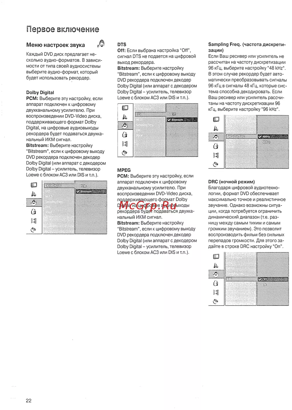 Первое включение Меню настроек звука 0 Каждый DVD диск предлагает не сколько аудио форматов В зависи мости от типа своей аудиосистемы выберите аудио формат который будет использовать рекордер Dolby Digital PCM Выберите эту настройку если аппарат подключен к цифровому двухканальному усилителю При воспроизведении DVD Video диска поддерживающего формат Dolby Digital на цифровые аудиовыходы рекордера будет подаваться двухка нальный ИКМ сигнал Bitstream Выберите настройку Bitstream если к цифровому выходу DVD рекордера подключен декодер Dolby Digital или аппарате декодером Dolby Digital усилитель телевизор Loewe с блоком АСЗ или DIS и т п 22 DTS Off Если выбрана настройка Off сигнал DTS не подается на цифровой выход рекордера Bitstream Выберите настройку Bitstream если к цифровому выходу DVD рекордера подключен декодер Dolby Digital или аппарат с декодером Dolby Digital усилитель телевизор Loewe с блоком АСЗ или DIS и т п MPEG PCM Выберите эту настройку если аппарат подключен к цифровому двухканальному усилителю При воспроизведении DVD Video диска поддерживающего формат Dolby Digital на цифровые аудиовыходы рекордера будет подаваться двухка нальный ИКМ сигнал Bitstream Выберите настройку Bitstream если к цифровому выходу DVD рекордера подключен декодер Dolby Digital или аппарат с декодером Dolby Digital усилитель телевизор Loewe с блоком АСЗ или DIS и т п Sampling Freq частота дискрети зации Если Ваш ресивер или усилитель не рассчитан на частоту дискретизации 96 кГц выберите настройку 48 kHz В этом случае рекордер будет авто матически преобразовывать сигналы 96 кГц в сигналы 48 кГц которые сис тема способна декодировать Если Ваш ресивер или усилитель рассчи таны на частоту дискретизации 96 кГц выберите настройку 96 kHz DRC ночной режим Благодаря цифровой аудиотехно логии формат DVD обеспечивает максимально точное и реалистичное звучание Однако возможны ситуа ции когда потребуется ограничить динамический диапазон т е раз ницу между самым тихим и самым громким звучанием Это позволит воспроизводить фильм без сильных перепадов громкости Для этого за дайте в строке DRC настройку On