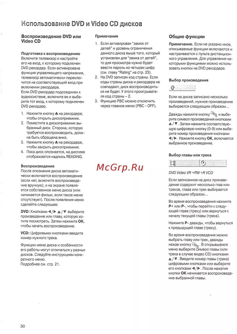 Использование DVD и Video CD дисков Воспроизведение DVD или Video CD Подготовка к воспроизведению Включите телевизор и настройте его на вход к которому подключен DVD рекордер Если активирована функция управляющего напряжения телевизор автоматически переклю чится на соответствующий вход при включении рекордера Если DVD рекордер подсоединен к аудиосистеме включите ее и выбе рите тот вход к которому подключен DVD рекордер 1 Нажмите кнопку А на рекордере чтобы открыть дископриемник 2 Поместите в дископриемник вы бранный диск Сторона которую требуется воспроизводить долж на быть обращена вниз 3 Нажмите кнопку А на рекордере чтобы закрыть дископриемник 4 Пока диск опознается на дисплее отображается надпись READING Воспроизведение После опознания диска автомати чески включается воспроизведение если нет включите воспроизведе ние вручную и на экране появля ется собственное меню диска или начинается фильм если такое меню отсутствует После появления меню сделайте следующее DVD Кнопками д v выберите произведение или главу которую хо тите посмотреть Затем нажмите ОК чтобы начать воспроизведение VCD Цифровыми кнопками введите номер нужного трека Функции меню диска и особенности его работы могут отличаться у разных дисков Следуйте инструкциям конк ретного меню Подробнее см стр 21 30 Примечания Общие функции 1 Если активирован замок от детей и уровень ограничения данного диска выше того который установлен для замка от детей то для просмотра нужно будет ввести пароль из четырех цифр см главу Rating на стр 23 2 На DVD записан код страны Если коды страны диска и рекордера не совпадают диск воспроизводить ся не будет У этого проигрывате ля код страны 2 3 Функцию РВС можно отключить через главное меню РВС OFF Примечание Если не указано иное описываемые функции включаются и настраиваются с пульта дистанцион ного управления Для управления не которыми функциями можно исполь зовать кнопки на DVD рекордере Выбор произведения Если на диске записано несколько произведений нужное произведение выбирается следующим образом Дважды нажмите кнопку и выбе рите символ произведения кнопками А V Затем нажмите соответствую щую цифровую кнопку 0 9 или выбе рите номер произведения кнопками Нажмите кнопку ОК включается выбранное произведение Выбор главы или трека DVD Video VR RW R VCD Если записанное на диск произве дение содержит несколько глав или треков глава или трек выбирается следующим образом Во время воспроизведения нажмите Р или Р чтобы перейти к следу ющей главе треку или вернуться к началу текущей главы трека Нажмите Р дважды чтобы вернуться к предыдущей главе треку Во время воспроизведения можно выбрать главу или трек дважды нажав кнопку В открывшемся меню выберите символ главы или трека в случае видео CD кнопками д v Введите номер главы трека цифровыми кнопками или выберите его кнопками После нажатия кнопки ОК начинается воспроизведе ние выбранной главы