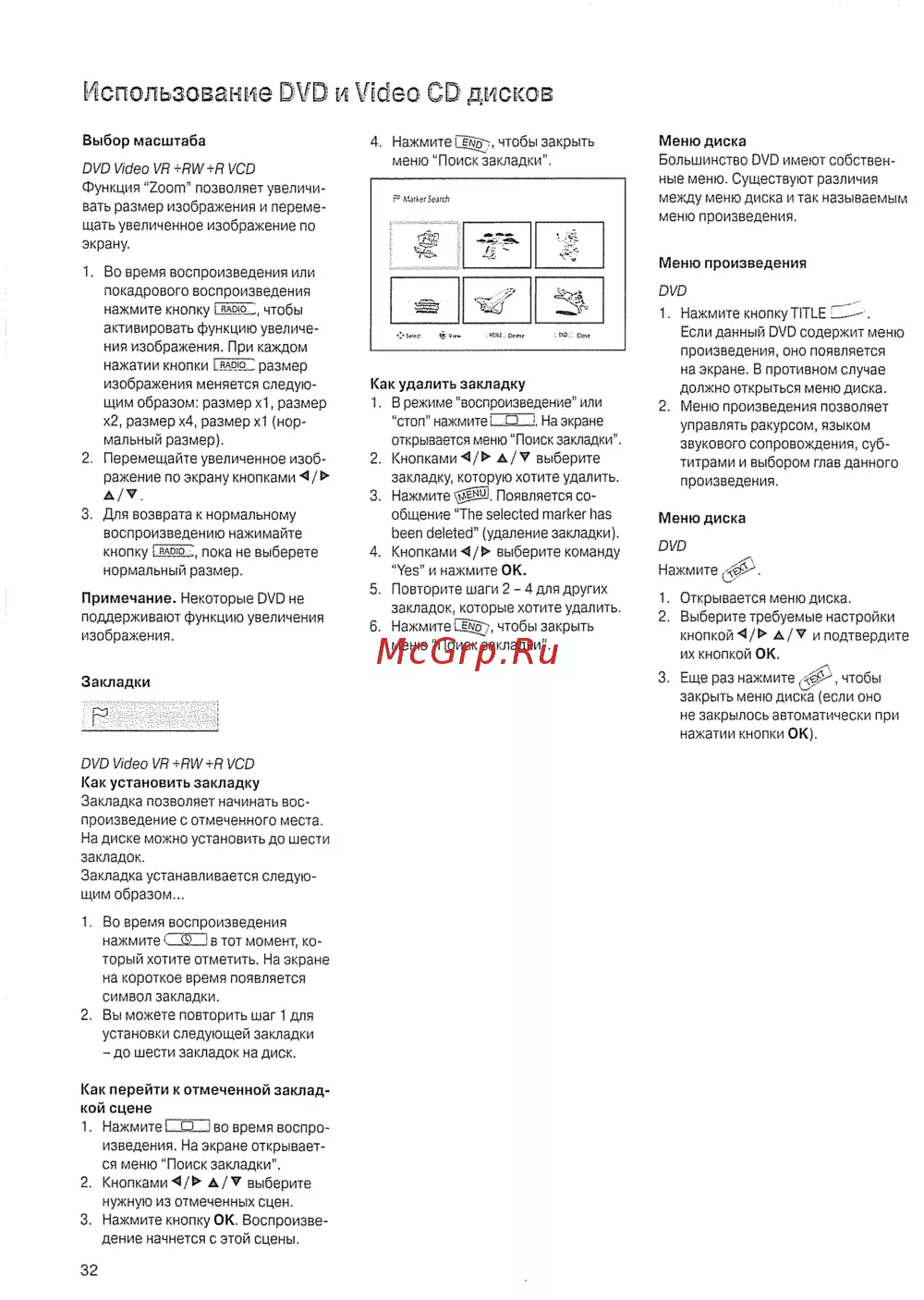 Использование DVD и Video CD дисков Выбор масштаба DVD Video VR RW R VCD Функция Zoom позволяет увеличи вать размер изображения и переме щать увеличенное изображение по экрану 1 Во время воспроизведения или покадрового воспроизведения нажмите кнопку LJADIO чтобы активировать функцию увеличе ния изображения При каждом нажатии кнопки LBAD O размер изображения меняется следую щим образом размер х1 размер х2 размер х4 размер х1 нор мальный размер 2 Перемещайте увеличенное изоб ражение по экрану кнопками V 3 Для возврата к нормальному воспроизведению нажимайте кнопку i RADÍO пока не выберете нормальный размер Примечание Некоторые DVD не поддерживают функцию увеличения изображения Закладки FFSÍÍSI DVD Video VR RW R VCD Как установить закладку Закладка позволяет начинать вос произведение с отмеченного места На диске можно установить до шести закладок Закладка устанавливается следую щим образом 1 Во время воспроизведения нажмите С Ф в тот момент ко торый хотите отметить На экране на короткое время появляется символ закладки 2 Вы можете повторить шаг 1 для установки следующей закладки до шести закладок на диск Как перейти к отмеченной заклад кой сцене 1 Нажмите L_Q_J во время воспроизведения На экране открывает ся меню Поиск закладки 2 КнопкамиА V выберите нужную из отмеченных сцен 3 Нажмите кнопку ОК Воспроизве дение начнется с этой сцены 32 4 Нажмите L o чтобы закрыть меню Поиск закладки г Marks Search Меню диска Большинство DVD имеют собствен ные меню Существуют различия между меню диска и так называемым меню произведения Меню произведения DVD Как удалить закладку 1 В режиме воспроизведение или стоп нажмите СД Л На экране открывается меню Поиск закладки 2 КнопкамиА V выберите закладку которую хотите удалить 3 Нажмите Появляется со общение The selected marker has been deleted удаление закладки 4 Кнопками выберите команду Yes и нажмите ОК 5 Повторите шаги 2 4 для других закладок которые хотите удалить 6 Нажмите Сё 7 чтобы закрыть меню Поиск закладки 1 Нажмите кнопку TITLE Если данный DVD содержит меню произведения оно появляется на экране В противном случае должно открыться меню диска 2 Меню произведения позволяет управлять ракурсом языком звукового сопровождения суб титрами и выбором глав данного произведения Меню диска DVD Нажмите 0 1 Открывается меню диска 2 Выберите требуемые настройки кнопкой A v и подтвердите их кнопкой ОК 3 Еще раз нажмите чтобы закрыть меню диска если оно не закрылось автоматически при нажатии кнопки ОК